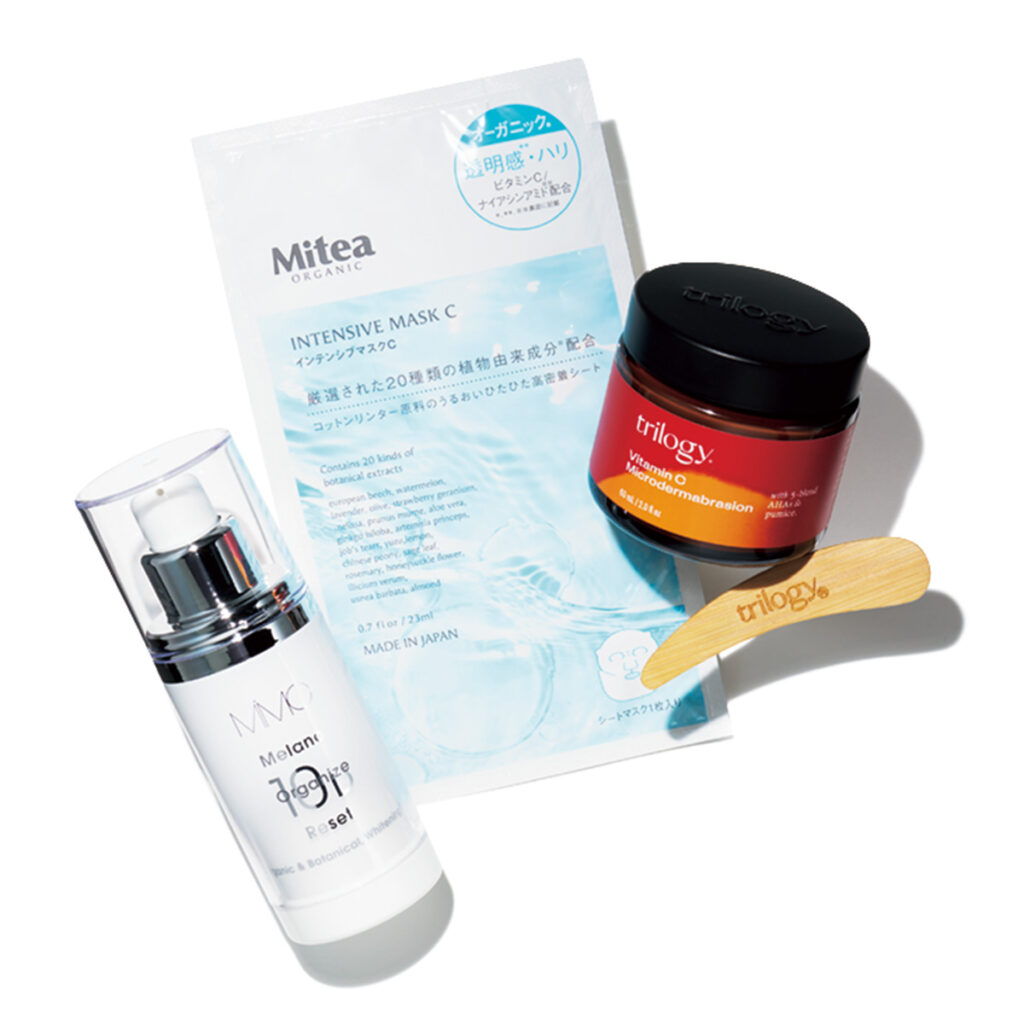 [右から]「ビタミンC配合のスクラブで、つるんと透明感のある肌に整います。くすみやザラつきが気になる時に」トリロジー Cスクラブ 60㎖ ¥3,740(コスメキッチン)「植物性ビタミンCとナイアシンアミド配合。ナチュラル処方のマスクの中ではかなりお手頃価格!」インテンシブマスクC ¥352(ミティア オーガニック) 「メラニン生成前から排出するまで、あらゆる段階のメラニンケアをしてくれる美白美容液。敏感肌でも使いやすい!」メラノオーガナイズリセット 10D[医薬部外品]30㎖ ¥9,900(MIMC)