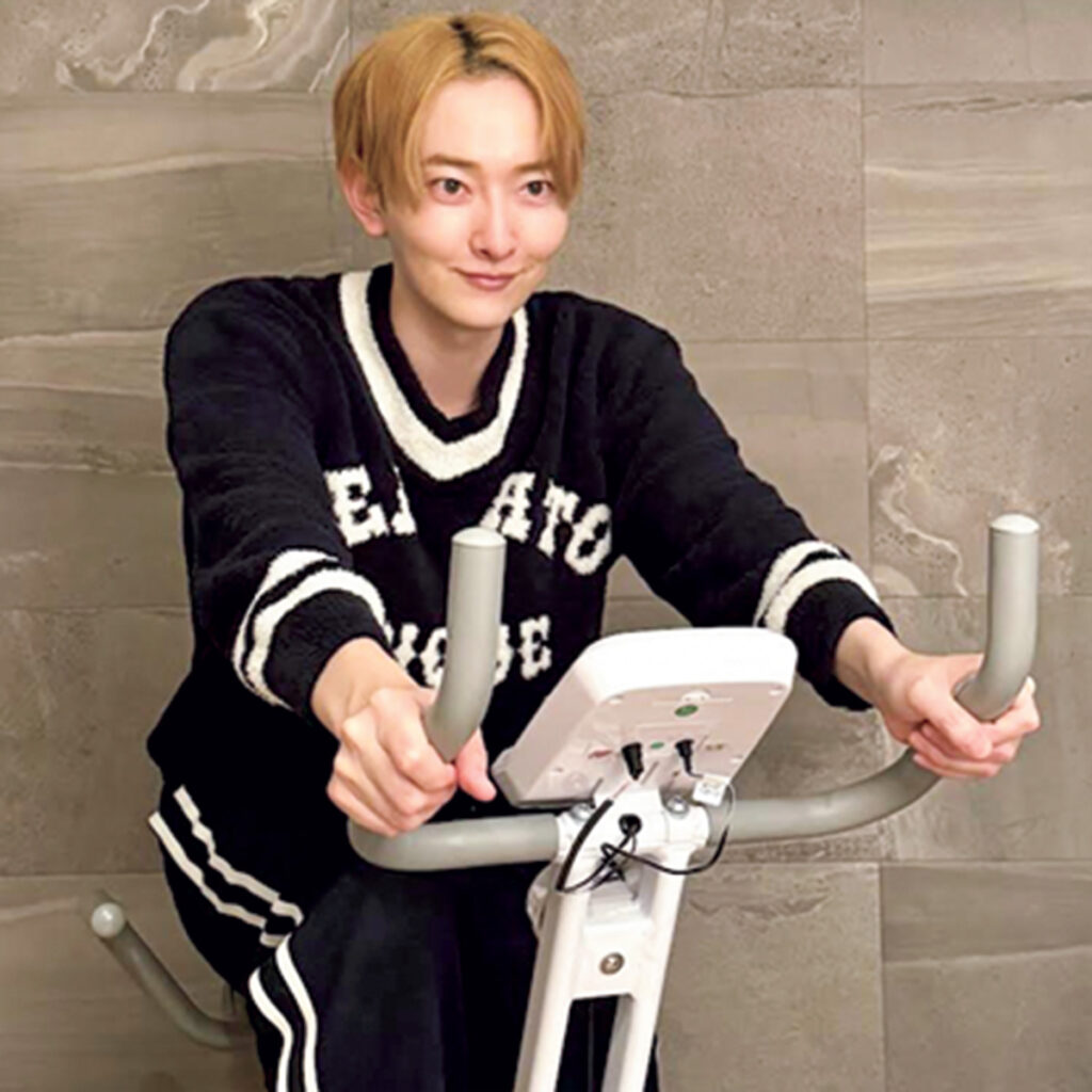 『血行が悪いと肌がくすんでしまうので、透明感のためには〝血行促進〟も大事なキーワード。僕はルームバイクを漕いで、血流のポンプの役割を果たす脚を動かしています。筋トレやストレッチは美肌にも有効的です。』