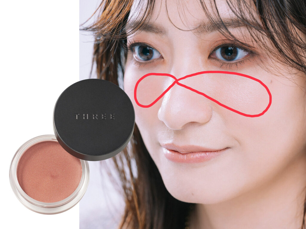 「濃いブラウンシャドウを使って、囲み目にしたのがポイント。ぐっと目元を引き締めつつも、アイライナーをガッツリ入れるよりナチュラルに仕上がります。チークは “薄く、広めに”入れるのが今っぽい! 顔の余白が減って、小顔効果が期待できます 」(KIKKUさん)