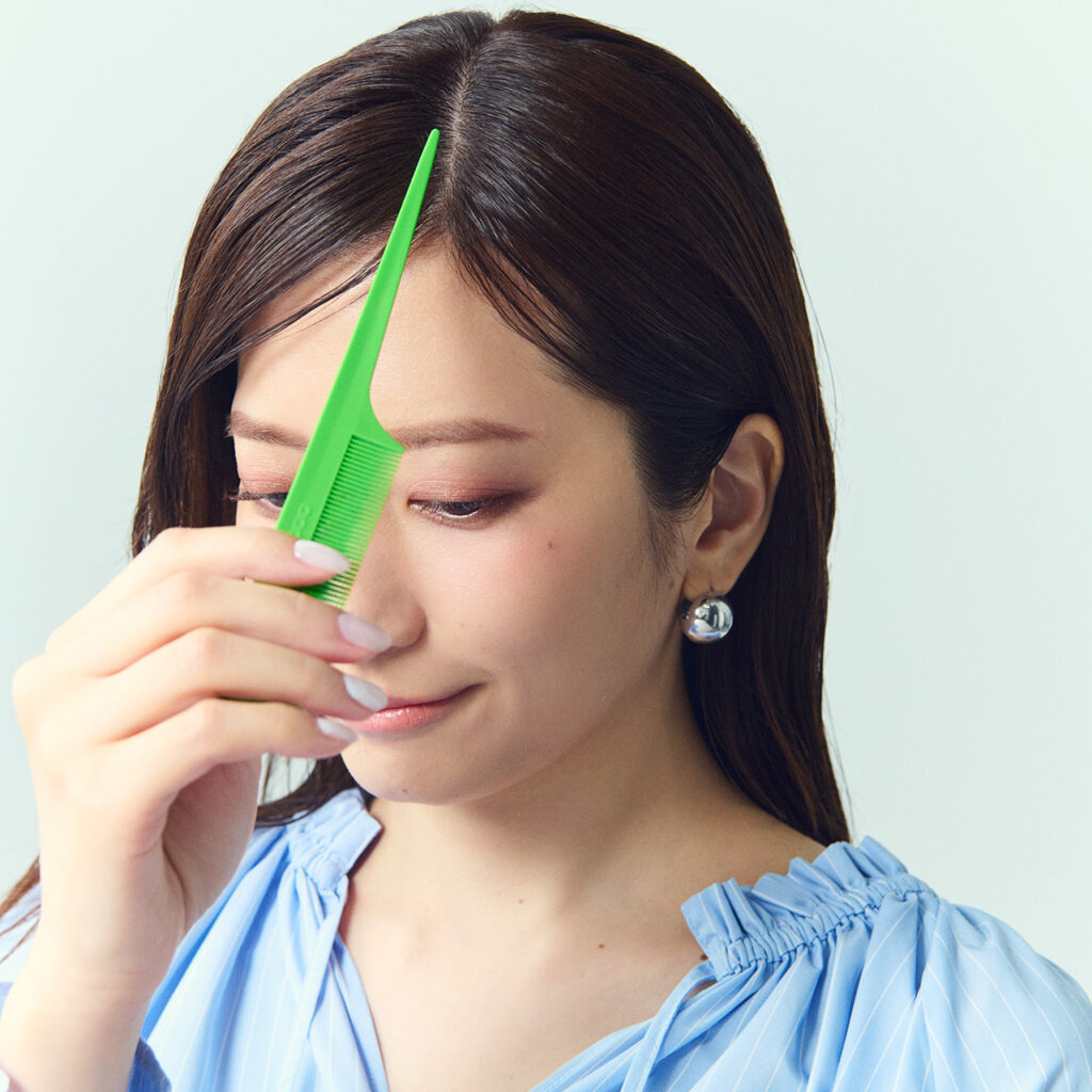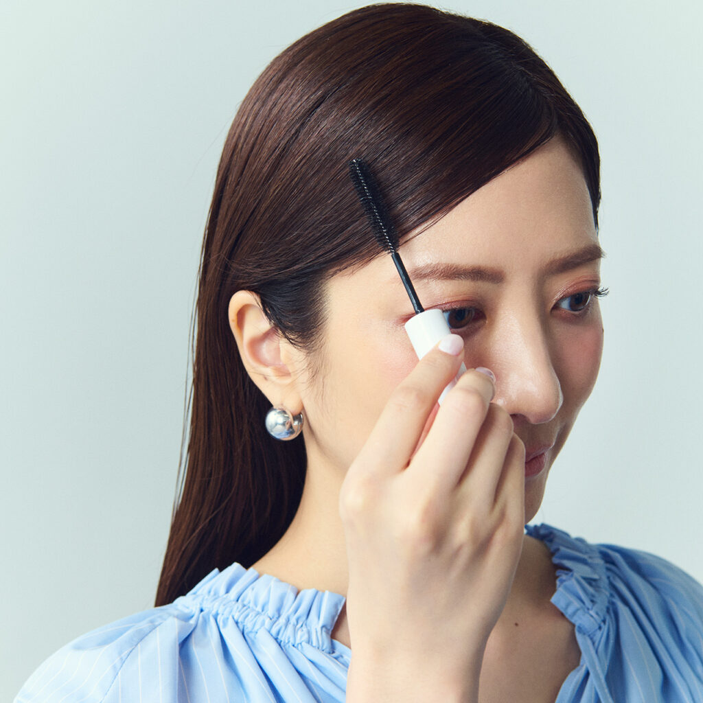 7:3に分け前髪を、丸みを持たせながらタイトに固定。ヘアマスカラを使ってセットすることで、風が吹いても乱れにくいのがうれしいポイント。顔まわりをタイトにしておくと大人っぽい印象になり、甘いディテールのトップスやワンピースともバランスが取りやすい!