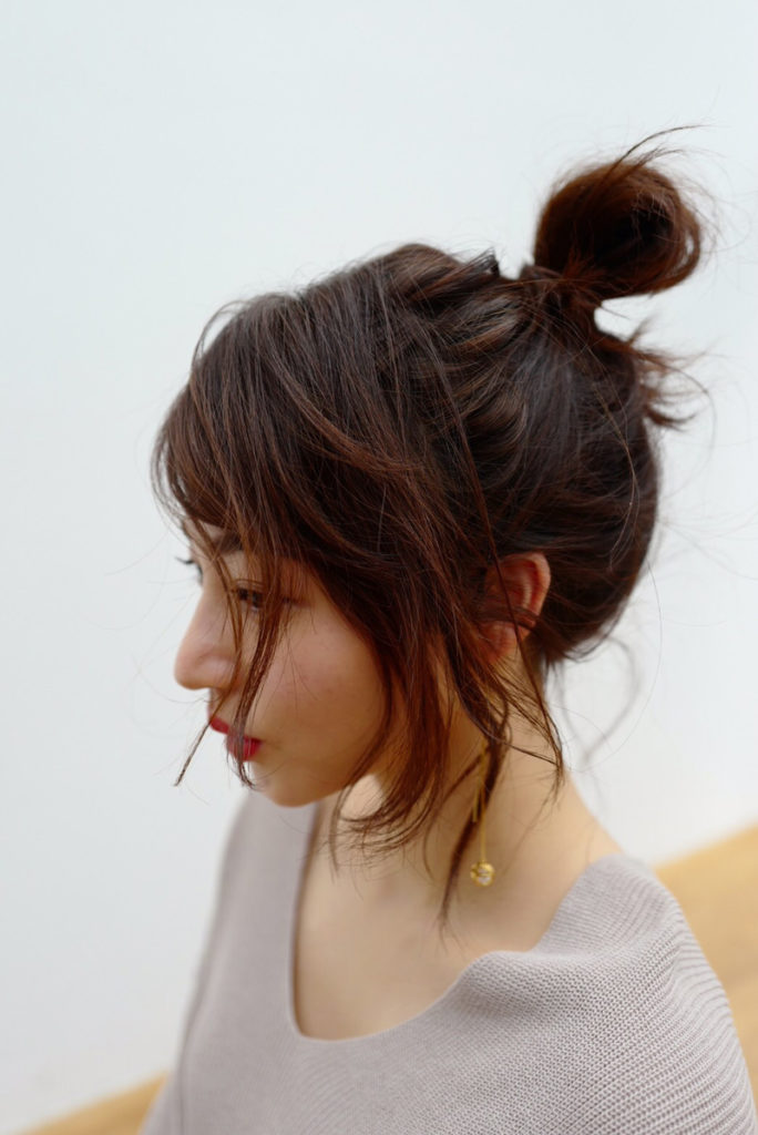 今月発売される3月号の撮影で、実際にされたアレンジをご紹介。普通の高めおだんごヘアですが、顔まわりにポイントが。前髪を9:1くらいでわけたら、多めにとった前髪と同じサイドの髪をトップからも引き出します。顔まわりの髪を大胆にたらすことで、自然なラフさが生まれ一気にこなれた印象に。