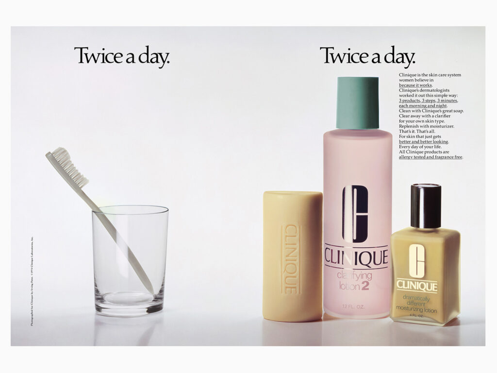 〝1日2回歯を磨くようにスキンケアをしよう〟というメッセージを伝える広告。今では当たり前の製品が主役の写真も、当時は珍しかったそう。