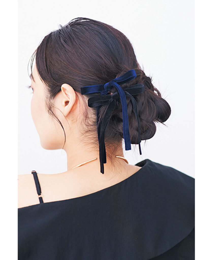 ひらりと揺れる細リボンが、後ろ姿を華奢に見せてくれます。細リボンを引き立てるには、後れ毛なしのすっきりしたお団子が好相性。リボンバレッタ各¥1,210(ともにアネモネ/サンポークリエイト)ブラウス¥12,980(GALLEST/ワールド プレスインフォメーション)チョーカー¥2,190(ザラ/ザラ カスタマーサービス)リング¥30,800(ボーニー/エドストローム オフィス)