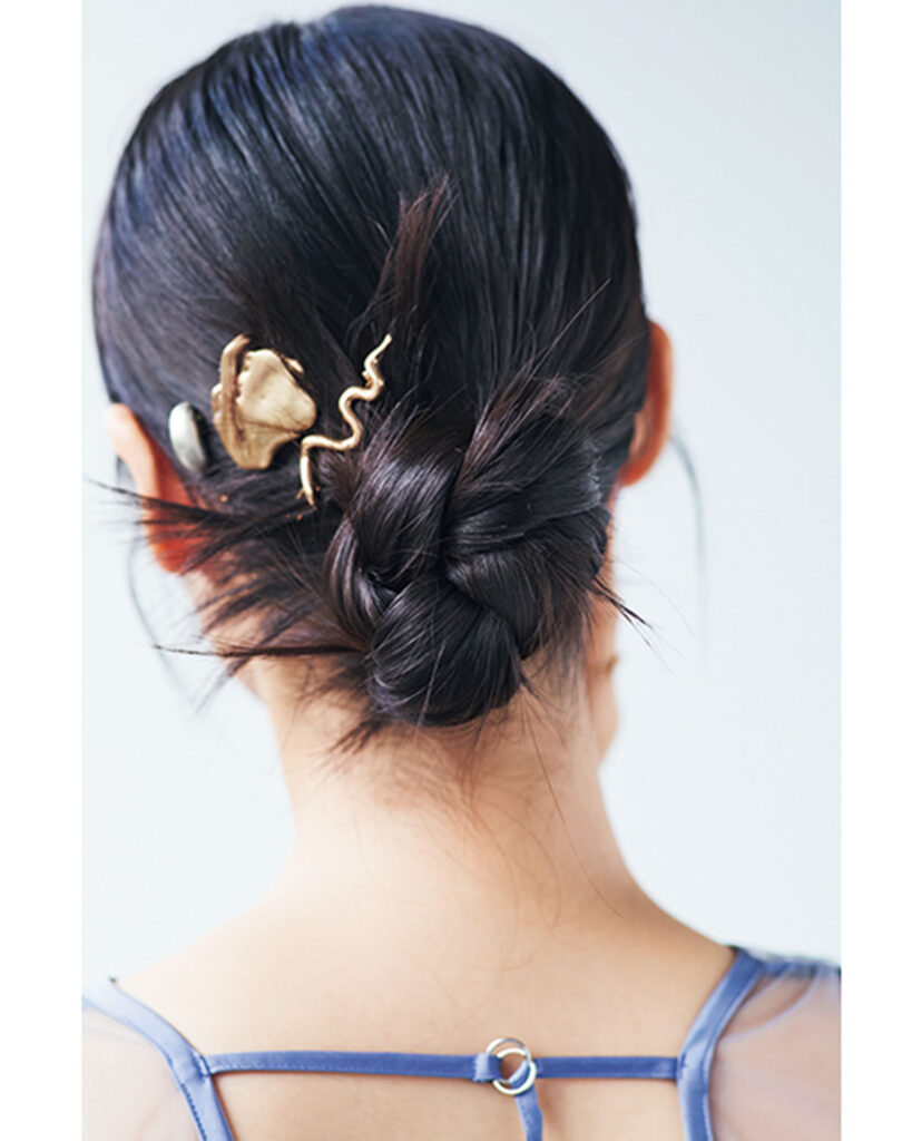 韓国発「カチモリ」は、毛先を残してまとめたお団子ヘアのこと。シャープな毛先が甘さを抑え、すっきりした印象に。地金アクセでお呼ばれに相応しい輝きを添えて。ヘアピン[スネークゴールド]¥16,500[小シルバー]¥14,300[大ゴールド]¥18,700(すべてプリュイ/プリュイトウキョウ)ワンピース¥26,400(FRAY I.D/FRAY I.D ルミネ新宿2店)中指リング¥9,900人さし指リング¥16,500(ともにアルティーダ ウード)