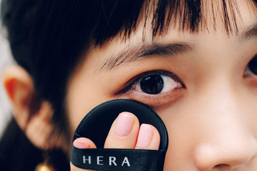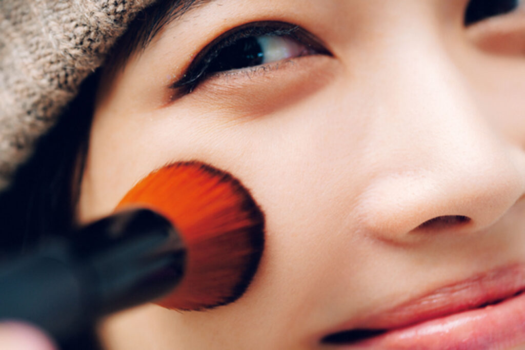 薄膜で密着度が高く、高保湿で乾燥崩れしにくい①のクッションファンデをチョイス。全顔に塗らなくても、頬など面積が広い部分だけでOK。