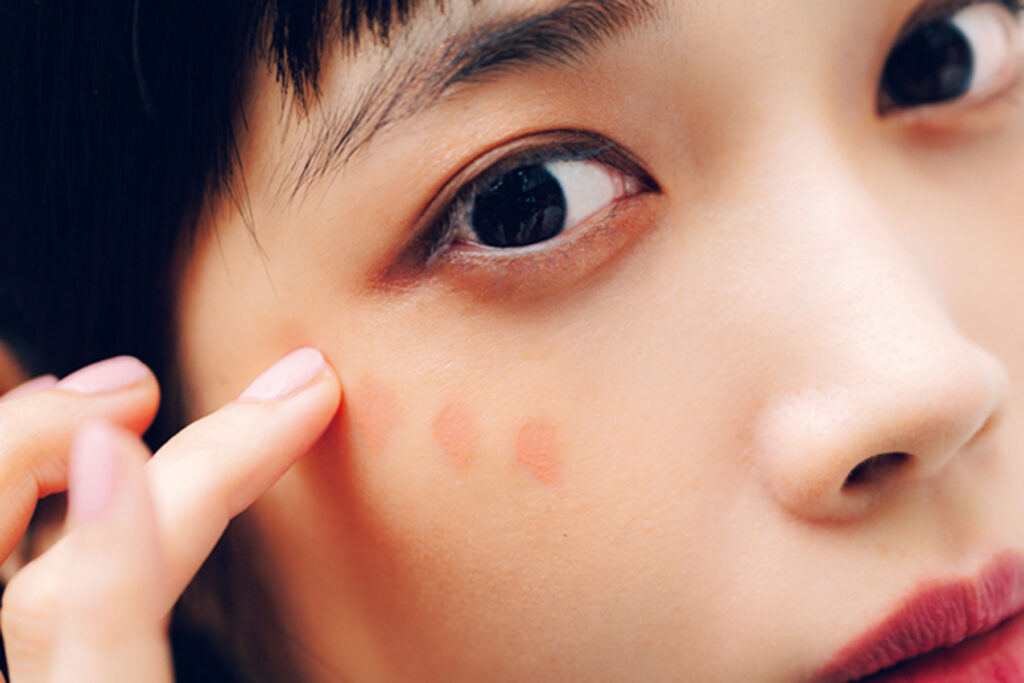 パウダーチークは落ちやすいため、リキッドタイプが正解。サンバイザーで目元が暗くなりがちなので②のチークを頬高めの位置に広げてフレッシュに。リップも崩れにくい③をチョイス。