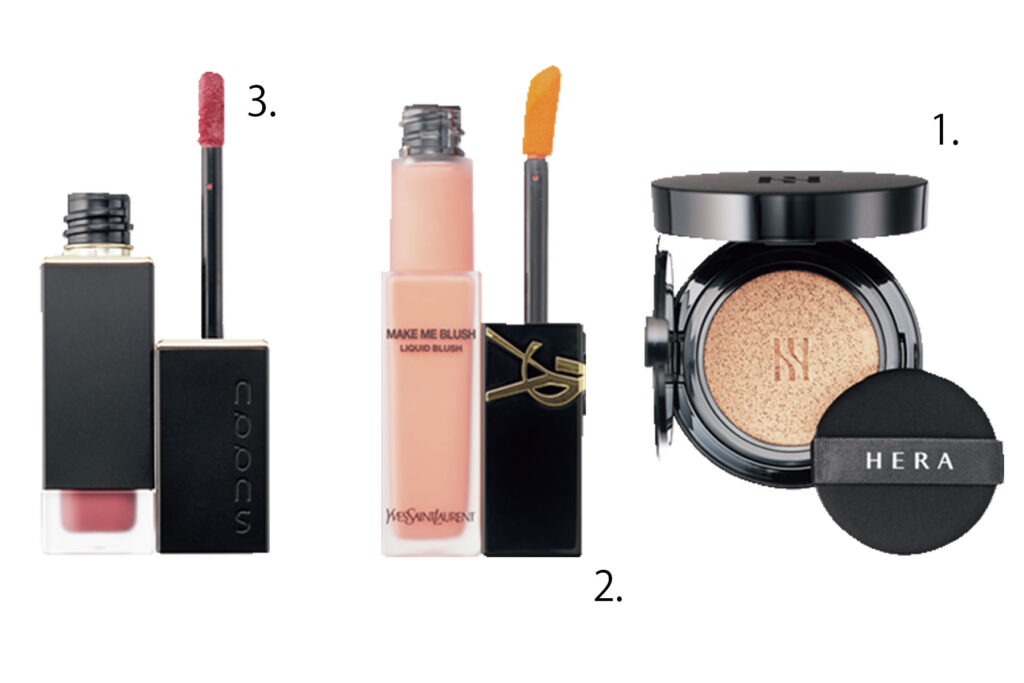①うるおいをキープしながら、皮脂コントロール効果も。HERA ブラック クッション ファンデーション〈SPF34/PA++〉全7色 15g¥6,380(HERA/アモーレパシフィックジャパン)②アクティブな印象のオレンジ。YSL メイクミーブラッシュ リキッド 57 ¥8,360(イヴ・サンローラン・ボーテ)③落ちにくさと心地よさを兼備したソフトマットな質感。SUQQU コンフォート リップ フルイド フォグ 03 ¥5,500(SUQQU)