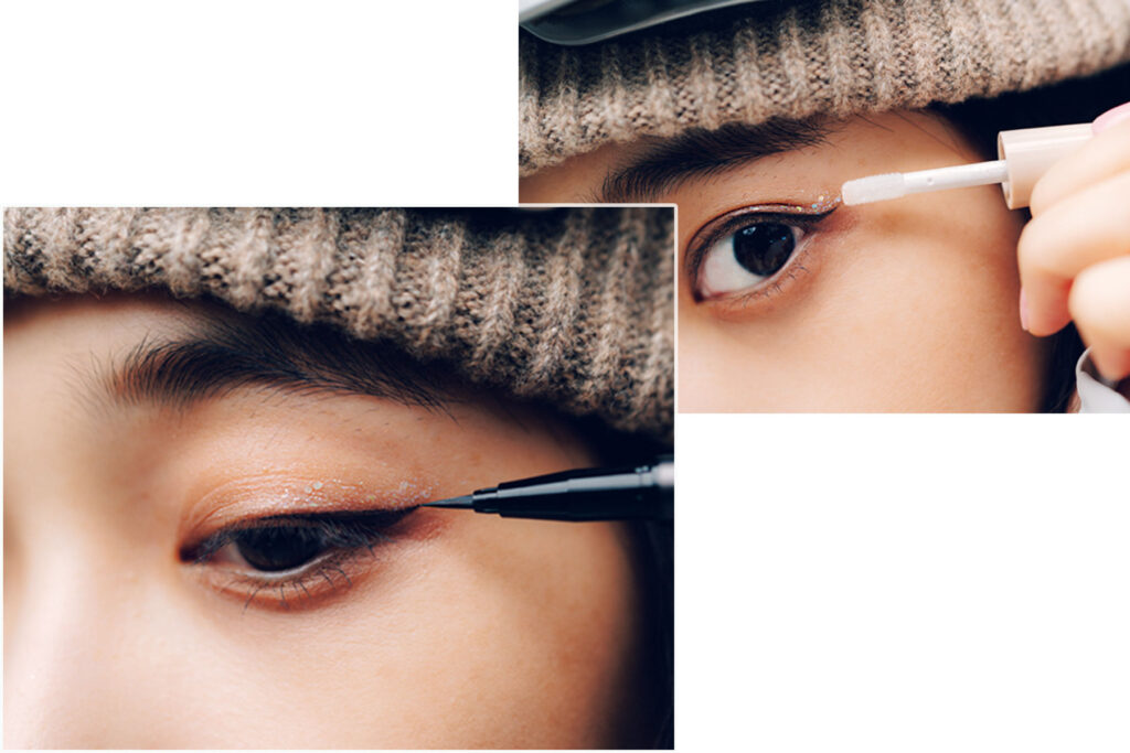 ⑦のグリッターを目尻にチップ幅でのせ、グリッターを広げるように指でぼかします。続いて⑧の黒のリキッドアイライナーで目元を引き締めて。黒目の上から目尻に向かって、ほんのりキャットラインに。
