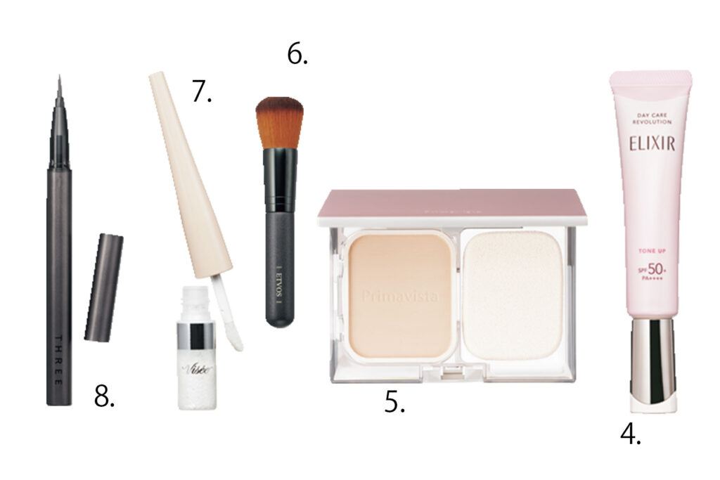 ④自然にトーンアップ。エリクシール デーケアレボリューション トーンアップ SP+ aa〈SPF50+/PA++++〉35g ¥3,410(エリクシール)⑤しっとりした粉質で、ムラになりにくい。プリマヴィスタ ブライトチャージ パウダー〈SPF16/PA+++〉全7色 9g ¥4,180※セット価格、編集部調べ(花王)⑥パウダーを早く、キレイにのせられる便利ツール。フェイスカブキブラシ¥2,420(エトヴォス)⑦グリッターがきらめきと立体感を演出。ヴィセ 3D グリッター アイリキッド WT-1 ¥1,540※編集部調べ(コーセー) ⑧ツヤを纏った、ウォータープルーフタイプ。THREE ファントゥファンキーリキッドアイライナー 06 ¥3,300(THREE)