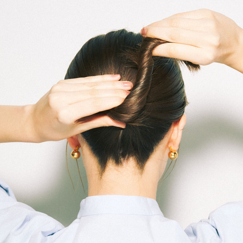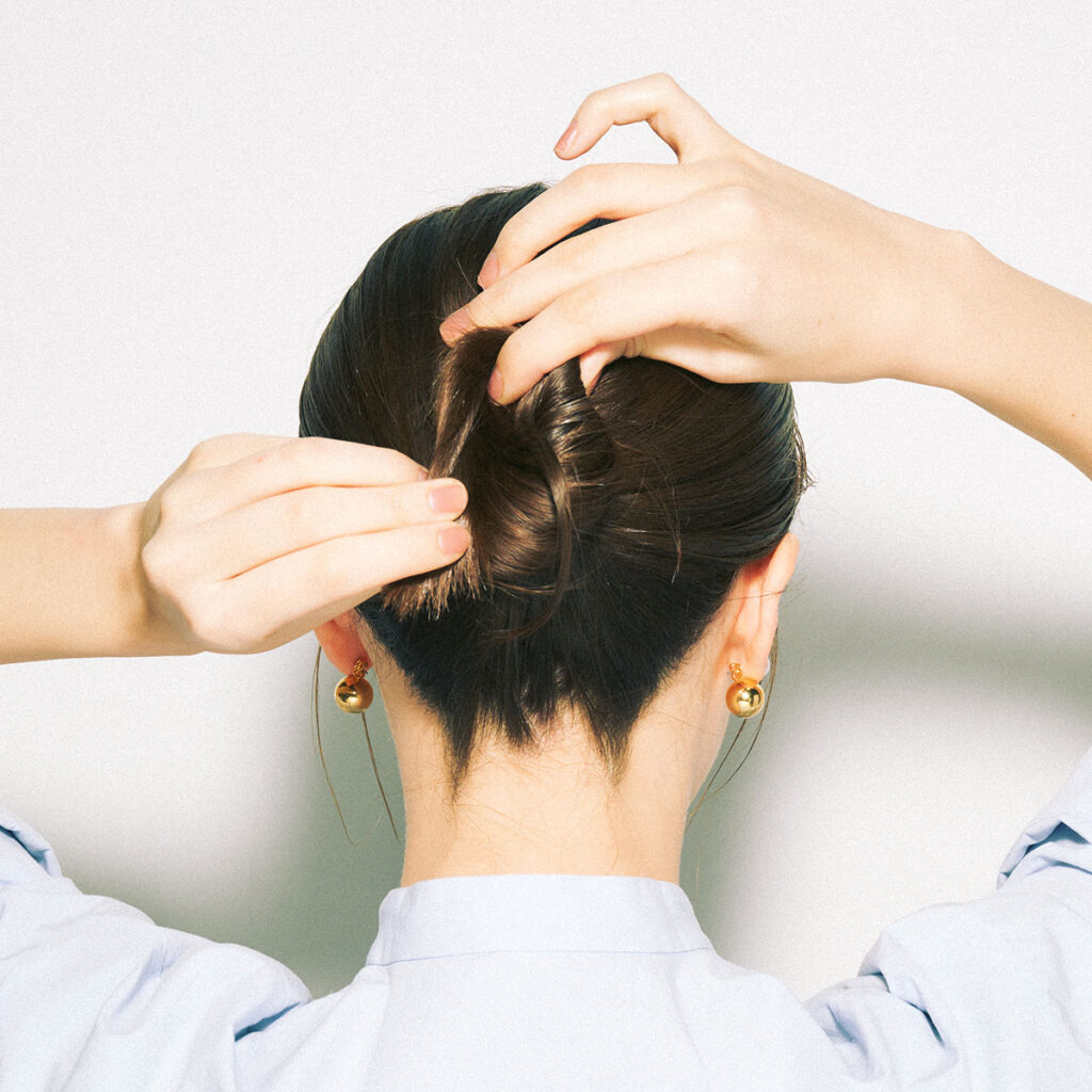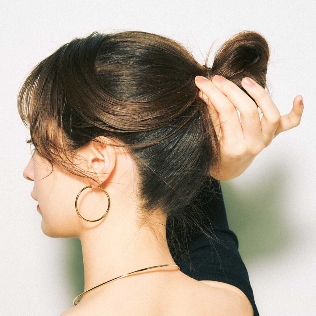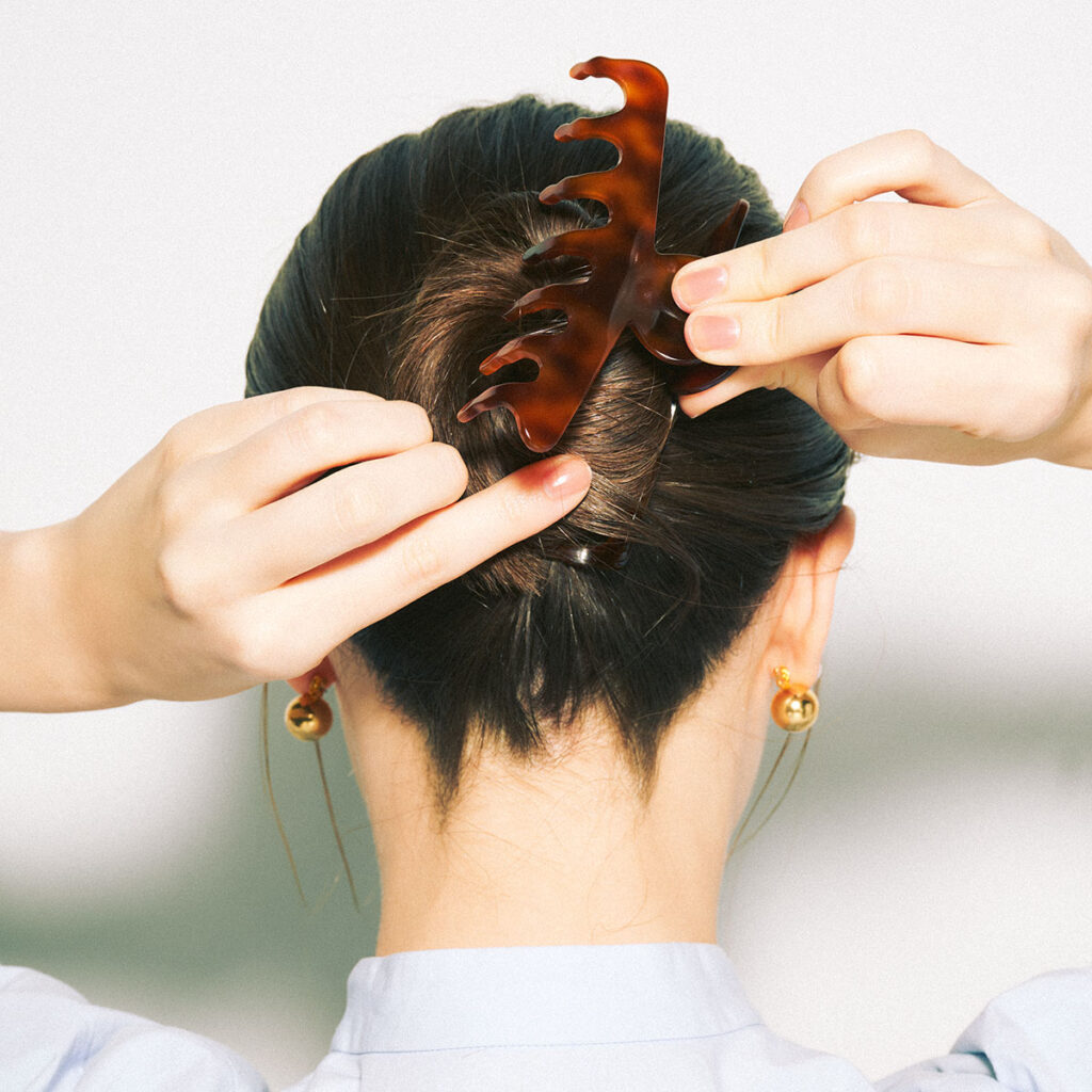 海外のファッションスナップのヘアアレンジでもお馴染みのクリップアレンジ。髪をねじって挟むだけだから、ご飯を食べる時やちょっと気分を変えたい時にサッとね。ヘアクリップ¥23,100(アレクサンドル ドゥ パリ/アレクサンドル ドゥ パリ GINZA SIX店)シャツ¥16,500(アンクレイヴ/オンワード樫山 お客様相談室)ピアス¥2,200(アネモネ/サンポークリエイト)