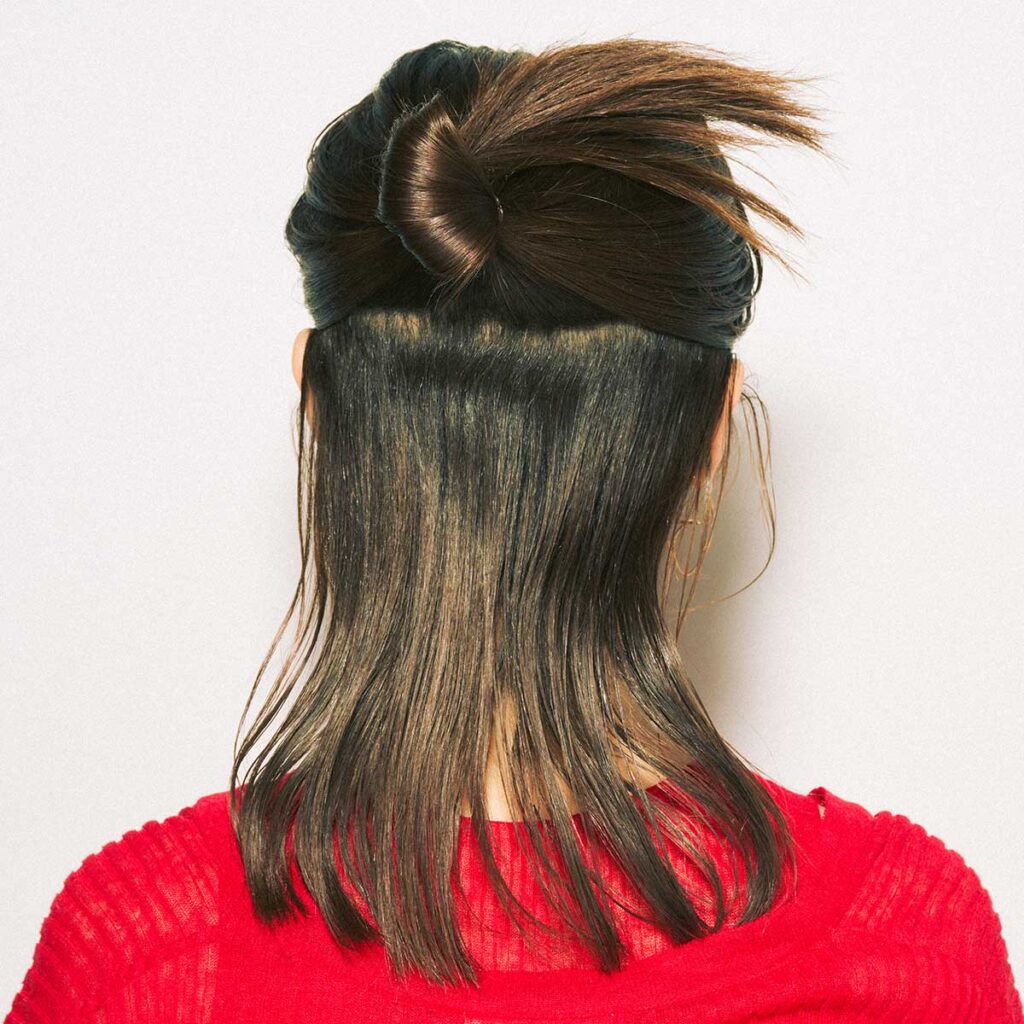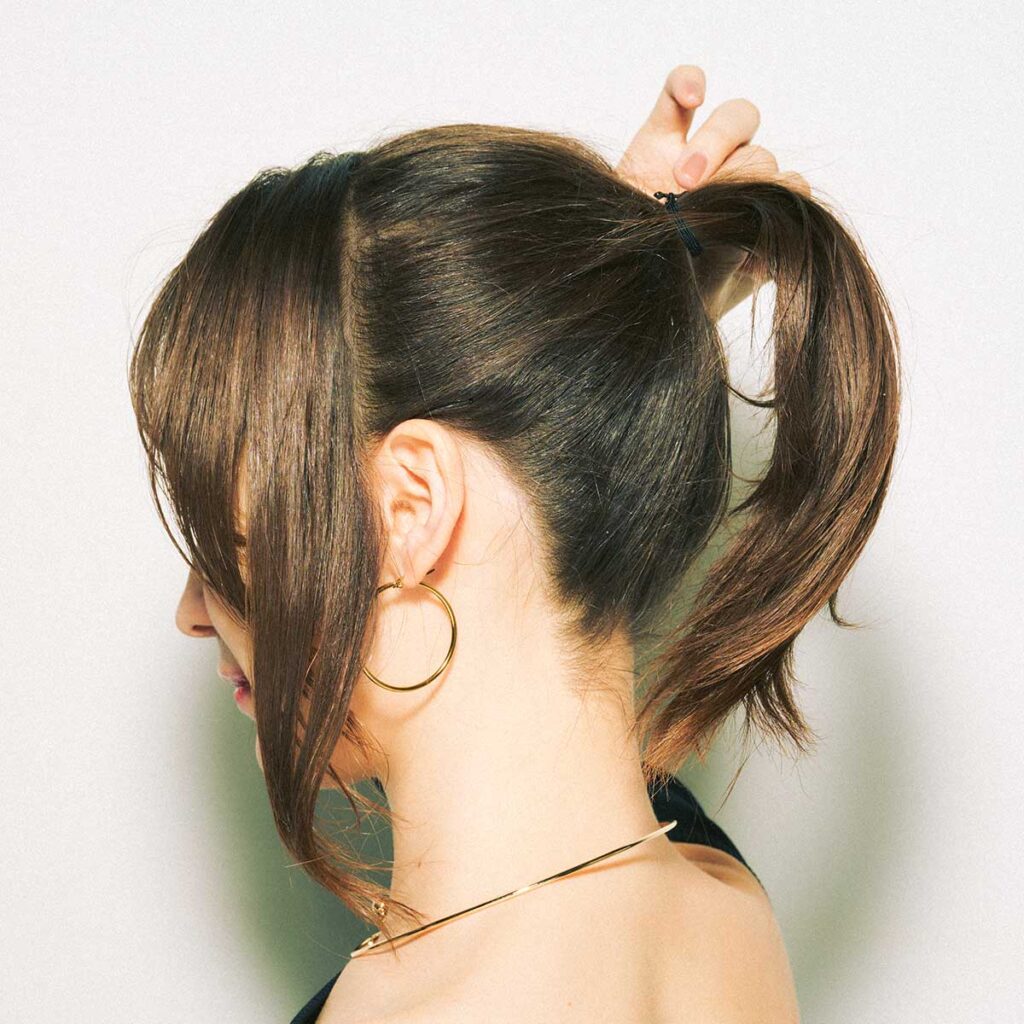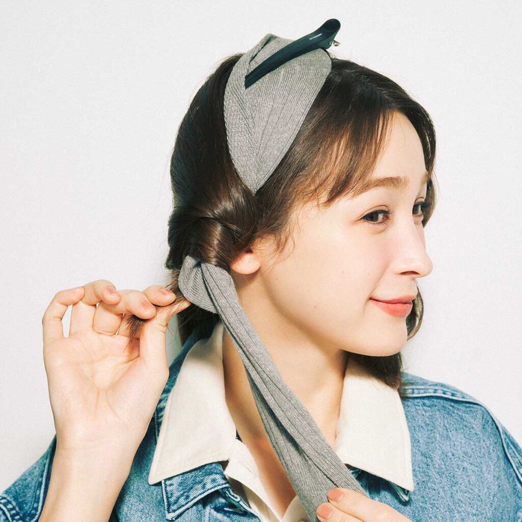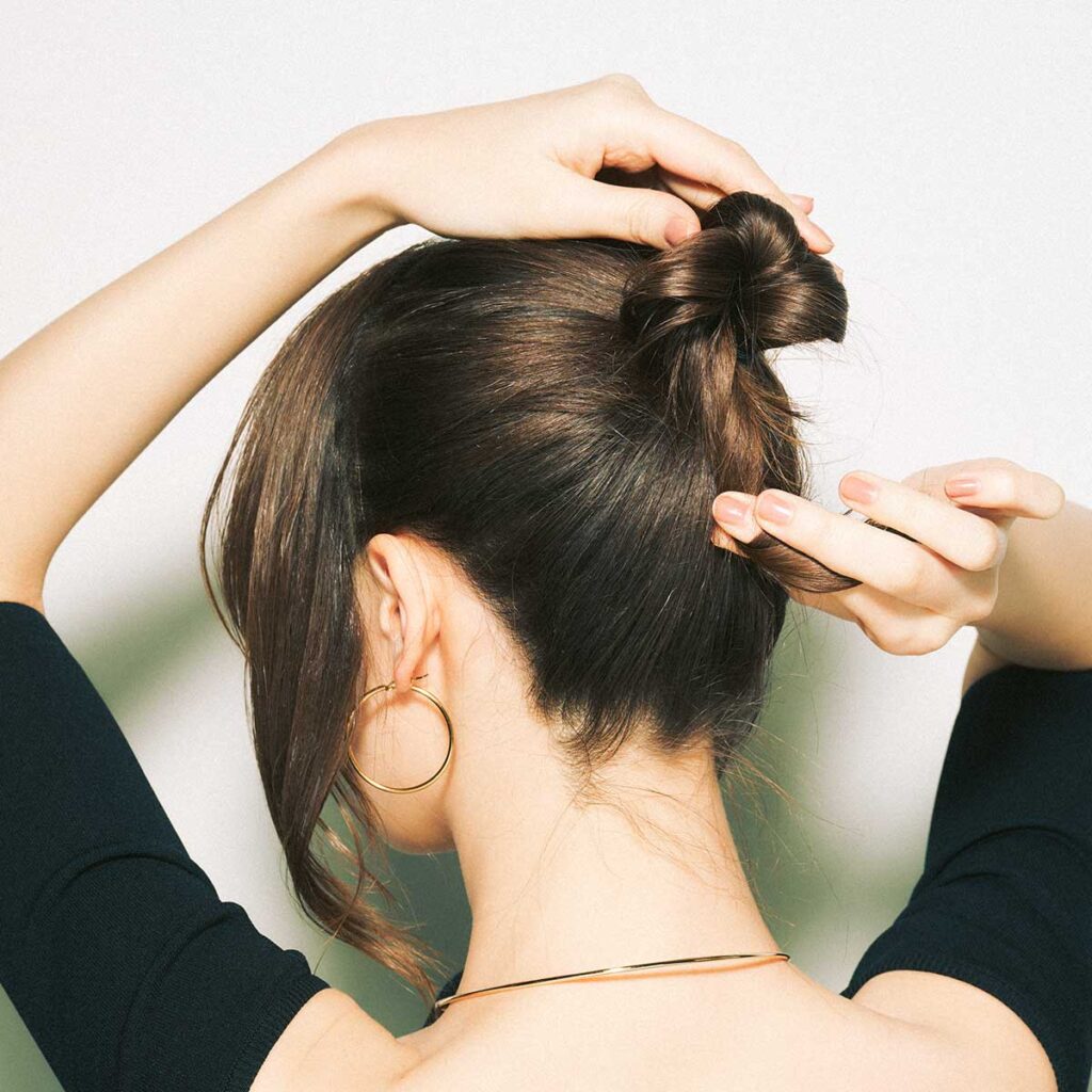 海外のファッションスナップのヘアアレンジでもお馴染みのクリップアレンジ。髪をねじって挟むだけだから、ご飯を食べる時やちょっと気分を変えたい時にサッとね。ヘアクリップ¥23,100(アレクサンドル ドゥ パリ/アレクサンドル ドゥ パリ GINZA SIX店)シャツ¥16,500(アンクレイヴ/オンワード樫山 お客様相談室)ピアス¥2,200(アネモネ/サンポークリエイト)
