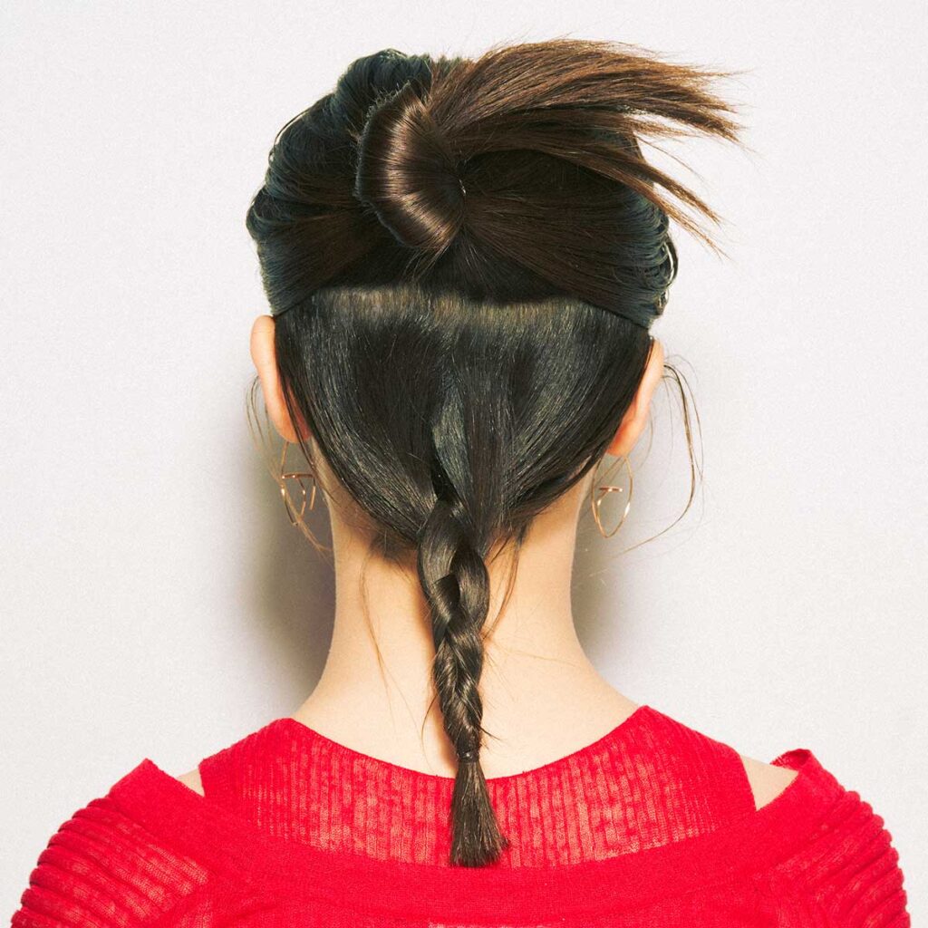 髪全体を上下二段に分けてそれぞれを三つ編みにするアレンジで、オシャレ感度の高さをさりげなくアピール。タイトにまとめることで大人っぽさをしっかりキープできます。ヘアリボン¥17,600(ジェニファー・ウォーレット/THE HAIR BAR TOKYO)カーディガン¥25,300タンクトップ¥17,600(ともにエンリカ/アッシュプラスエリオトロープ)ピアス¥155,100(ヒロタカ/ヒロタカ 表参道ヒルズ)