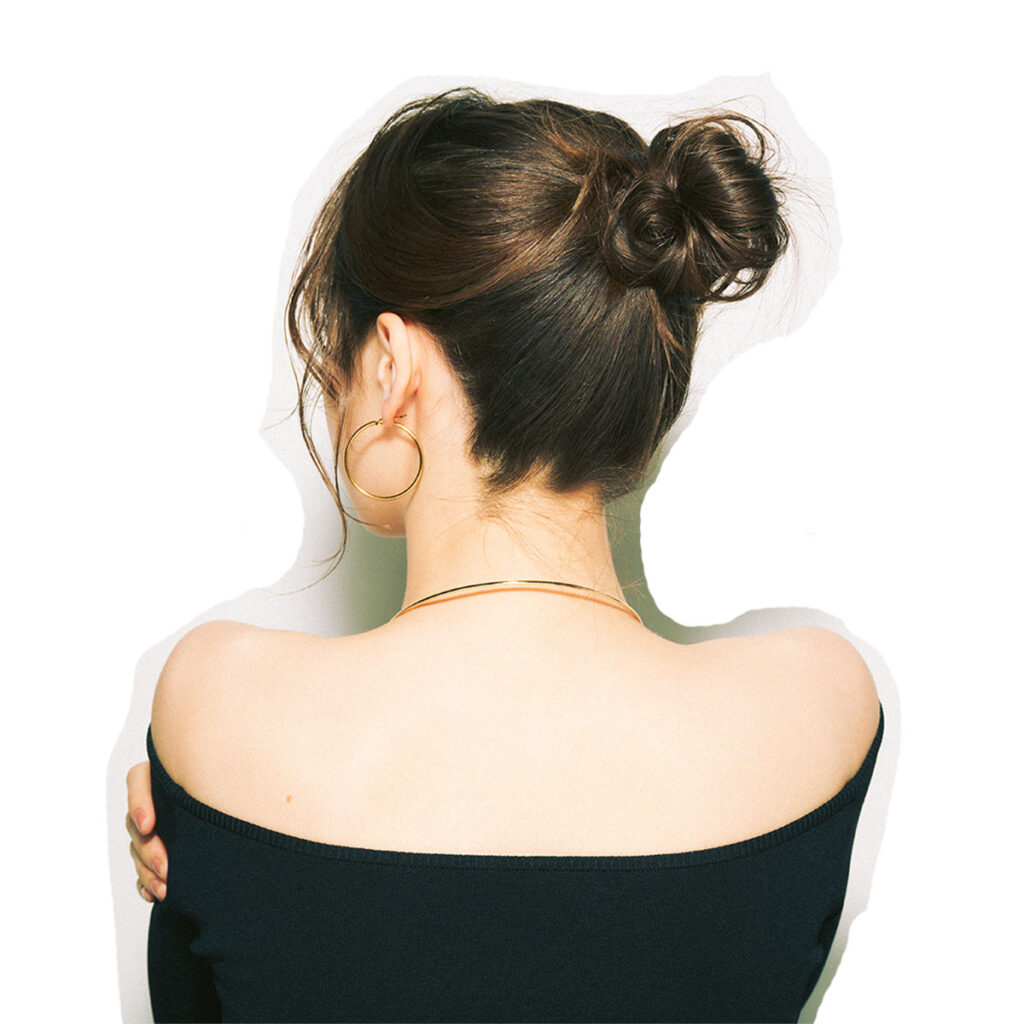 サッとまとめたようなまとめ髪って、色っぽさの極み。ポイントは顔のサイドにこだわること。髪を耳周りで緩ませたり、後れ毛を残すことでさらに艶っぽい雰囲気が加速。カットソー¥19,000(シーニュ)チョーカーネックレス¥3,630ピアス¥2,640(ともにアネモネ/サンポークリエイト)