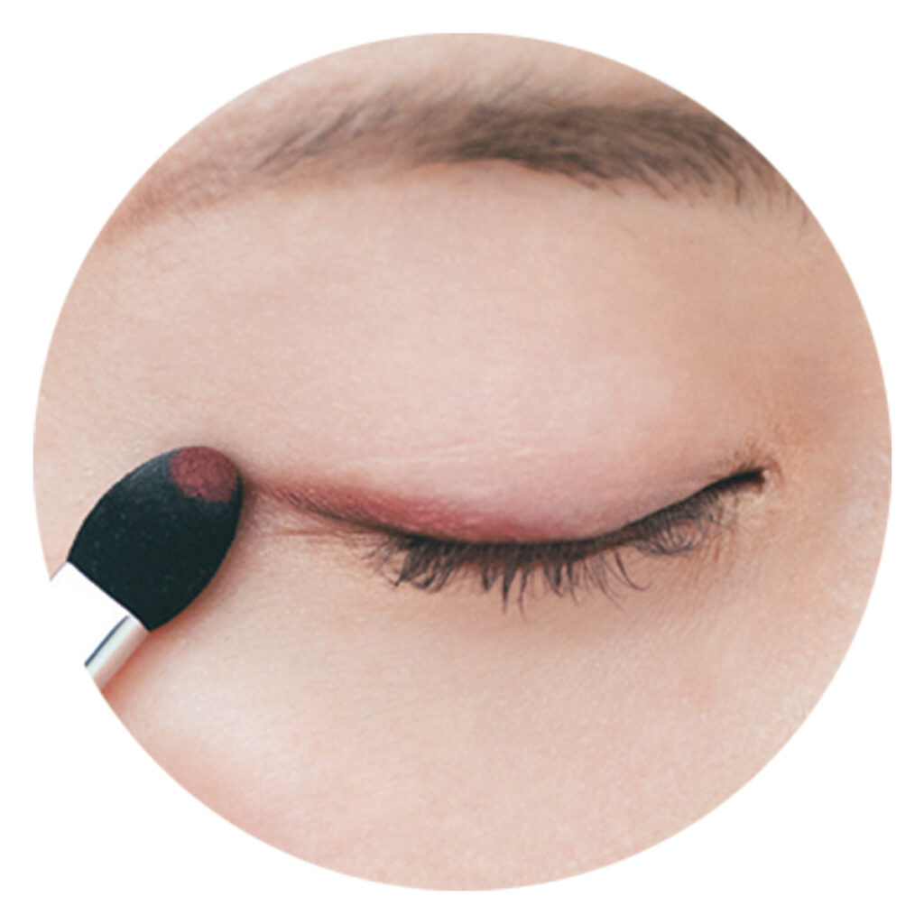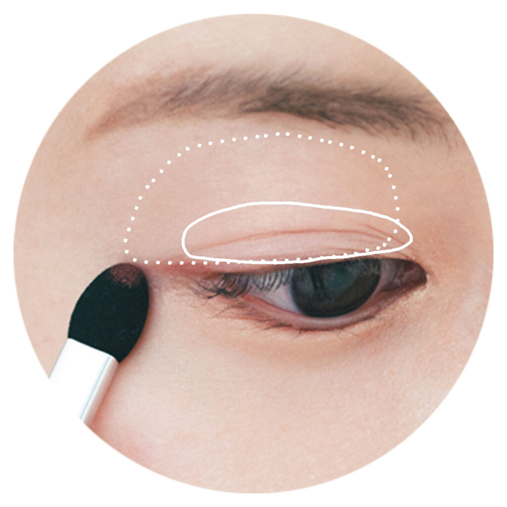 cの②で下地を整えたら、①をアイホール全体に重ねる。目幅を持たせたいので、目尻側を広めにぼかしておきます。