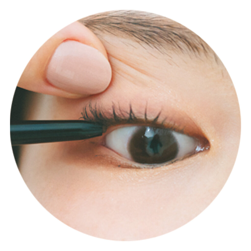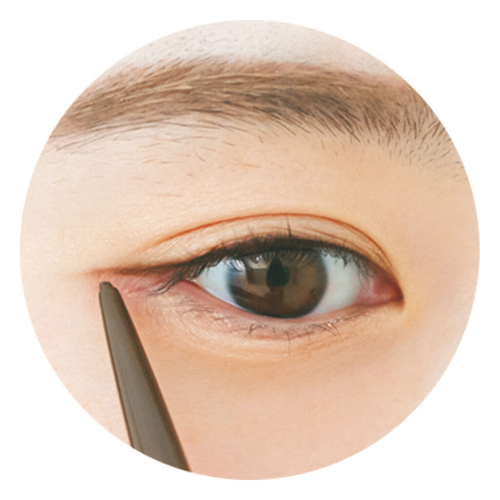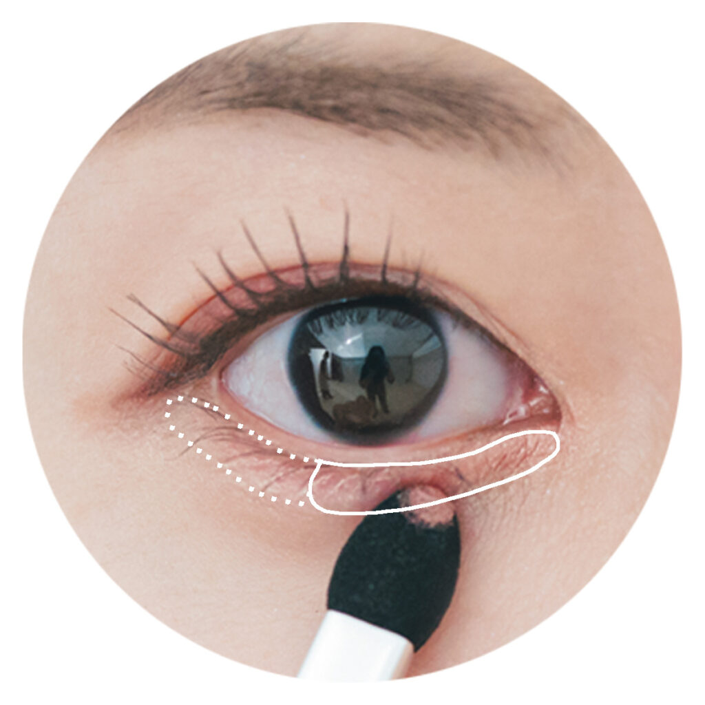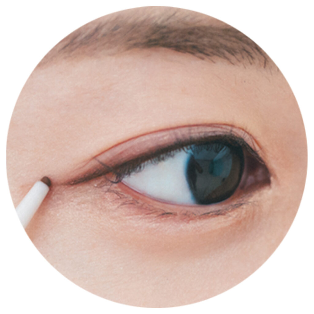 まつげの隙間を埋めるようにaでインラインを引いたら、目尻は真横にスッと。上からベビー綿棒でなぞってぼかす。