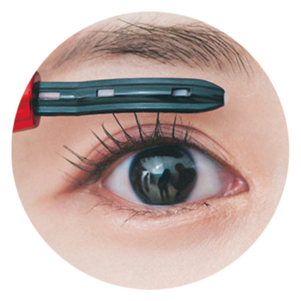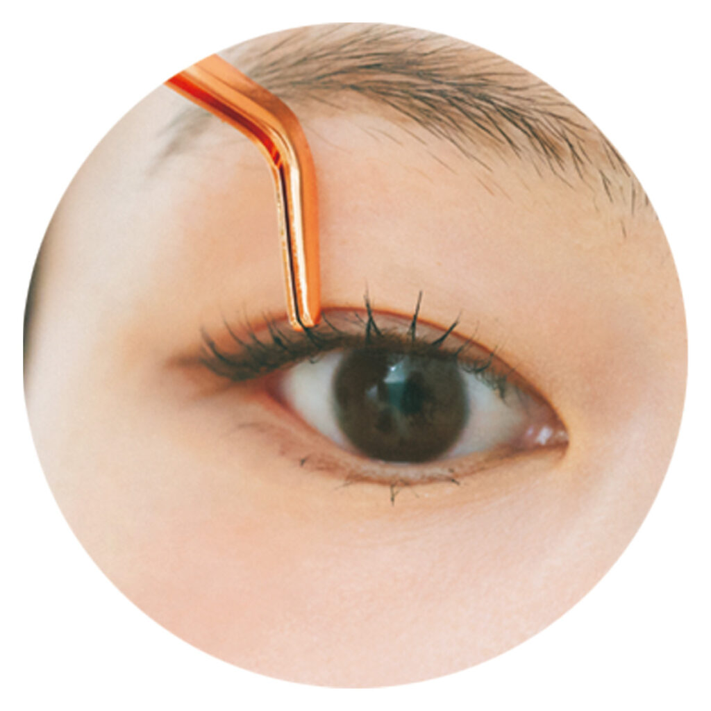 bのマスカラを塗る前後にホットビューラーでまつげを先端まで整える。このとき、目は開けたまま、目線は正面に。