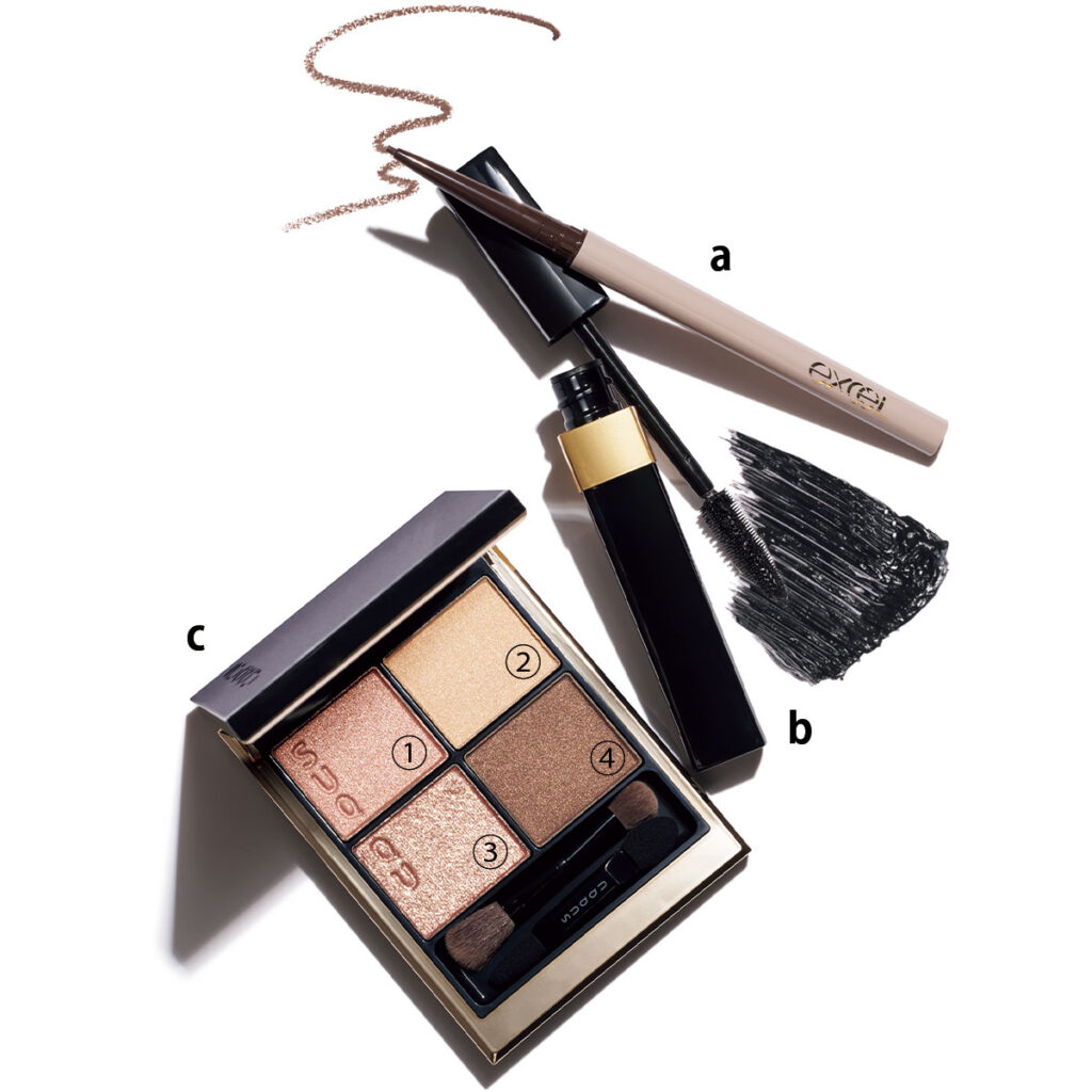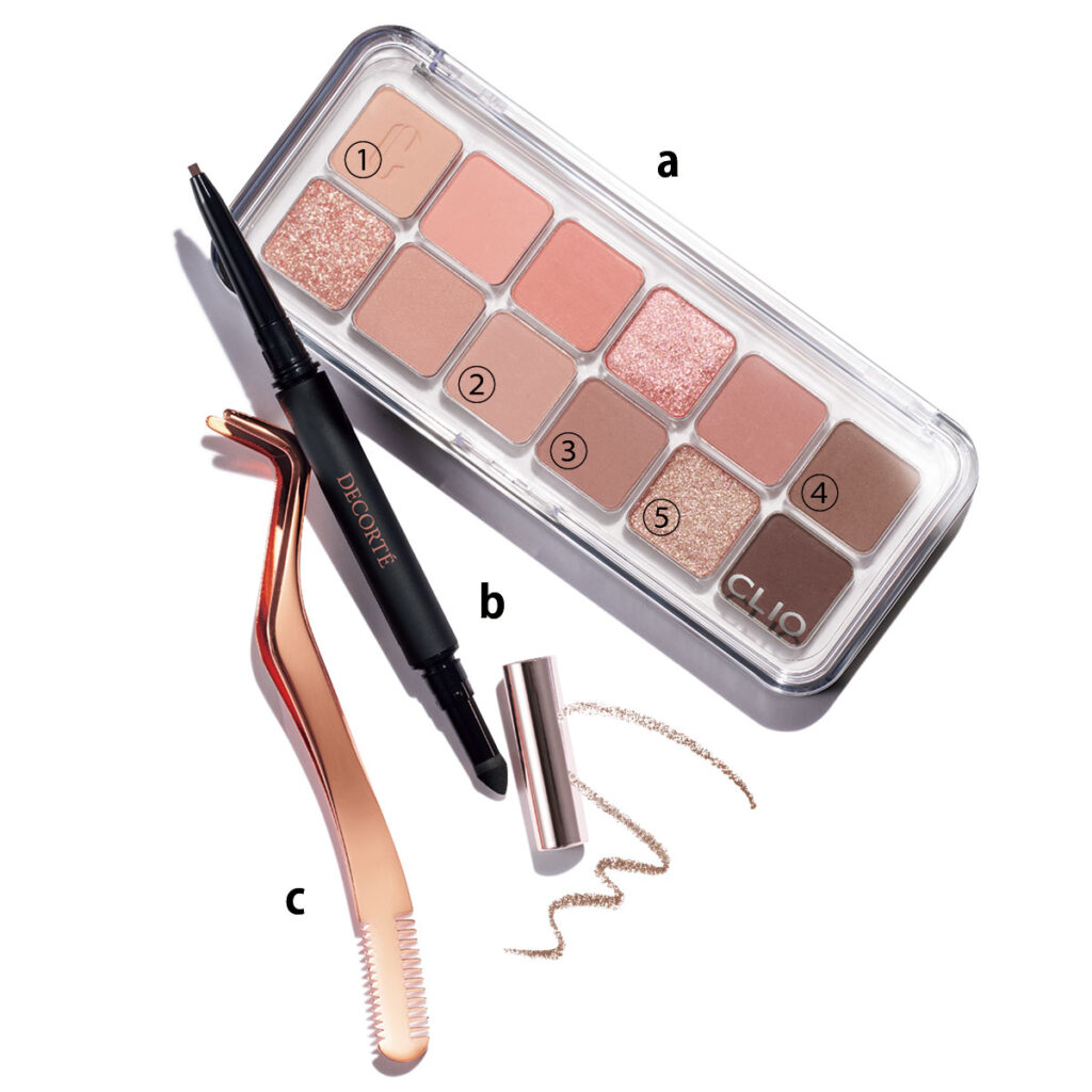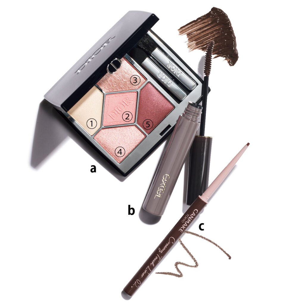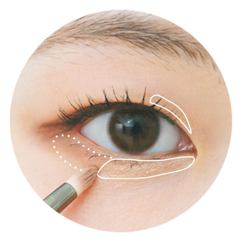アイホール広めにaの①を塗りベースを整えたら、それより狭めの位置に②を、目尻広めに重ねて目幅を自然に拡張。