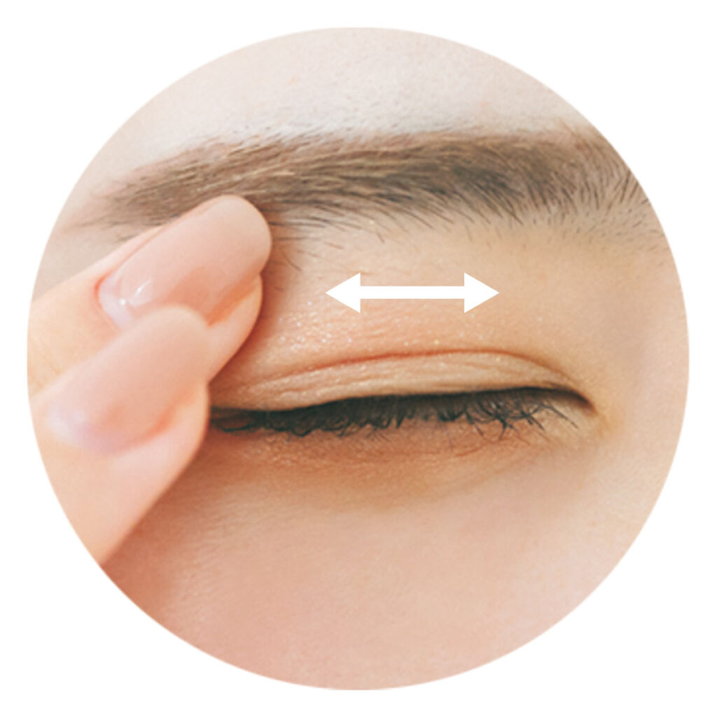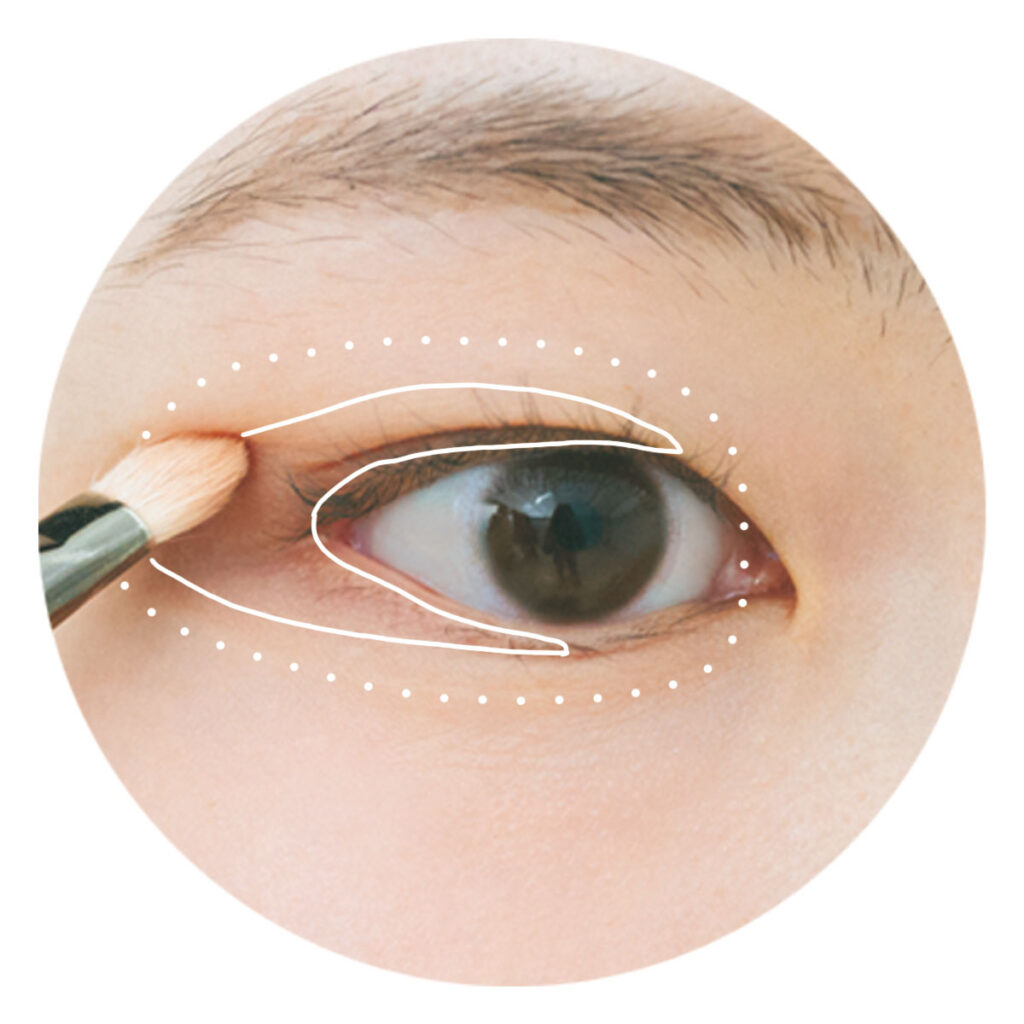 aの①を上下まぶた全体、②を上下の点線部分にのせ、③を上まぶたの際〜下まぶた黒目の下までくの字に重ねる。