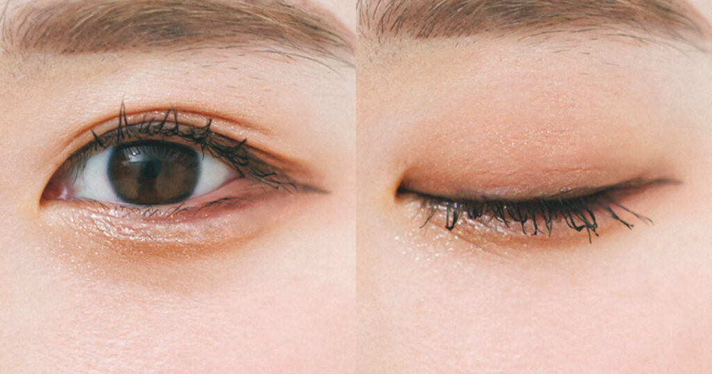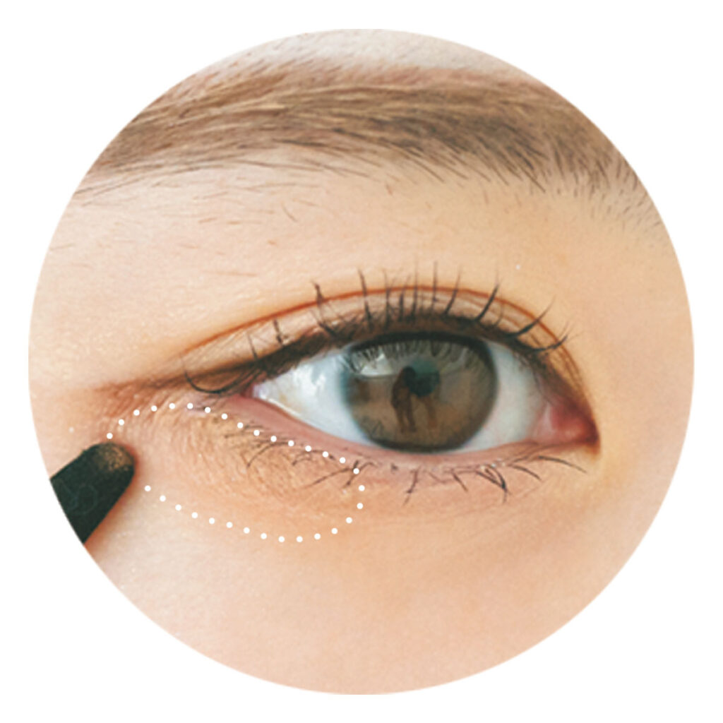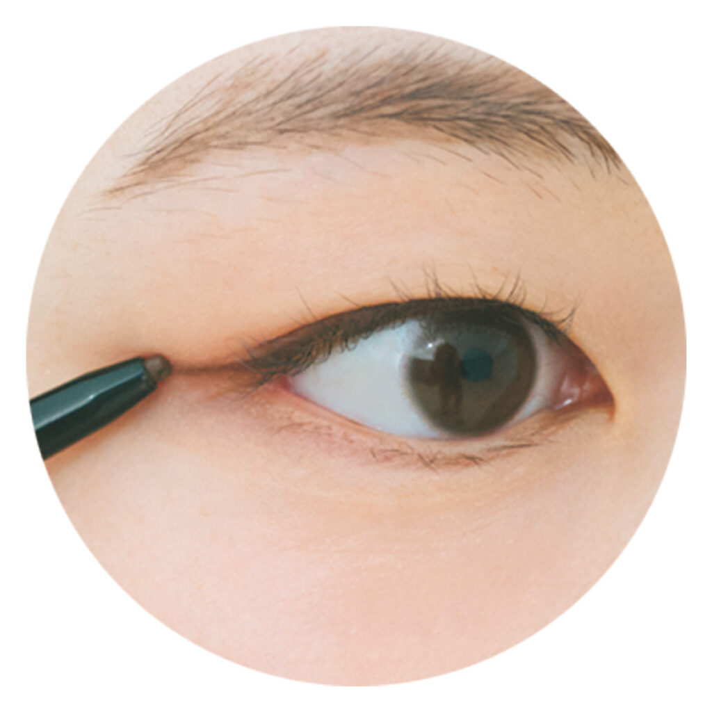 目を開けて前を向いた状態で見える位置に、アイラインを引く。目尻に向かってぼかし、横の広がりを持たせる。