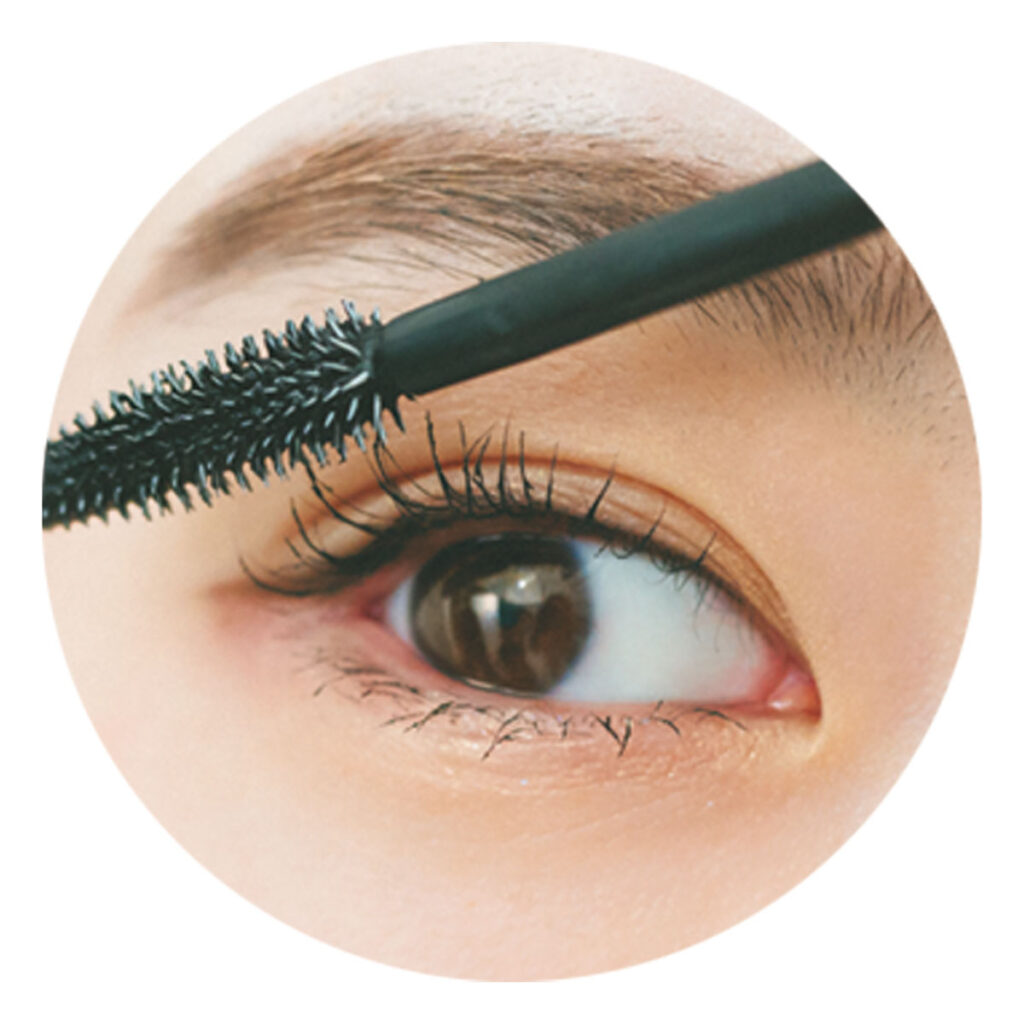 ビューラーでまつげを上げたら、bのマスカラは軽く。アイラインに沿うように、目尻側は外側に流して一体感を。