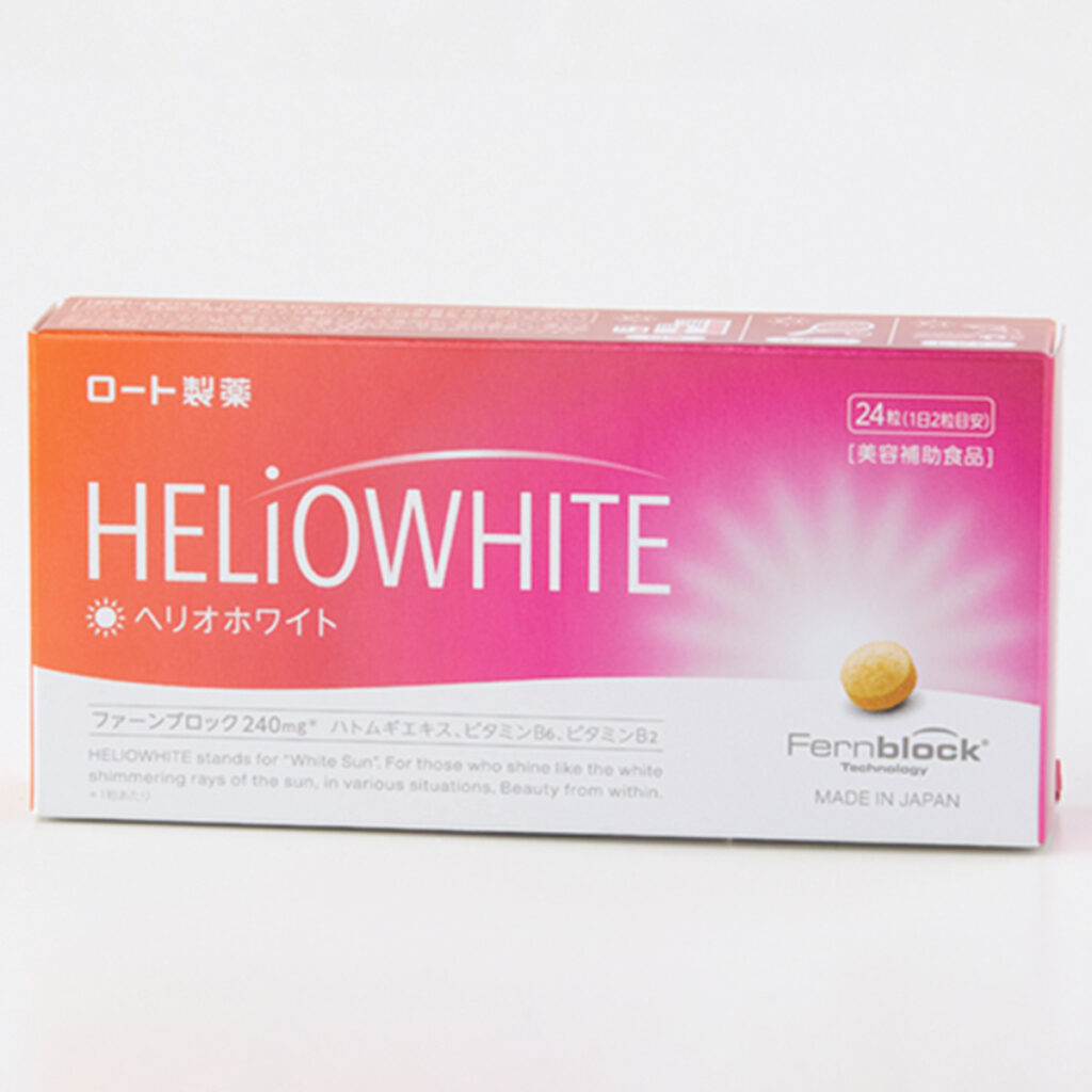 世界中で飲む日焼け止め効果を認められている成分“ファーンブロック”を1粒に240mg配合。ハトムギエキスなどの美容サポート成分も。ヘリオホワイト 24粒¥2,592[編集部調べ](ロート製薬)