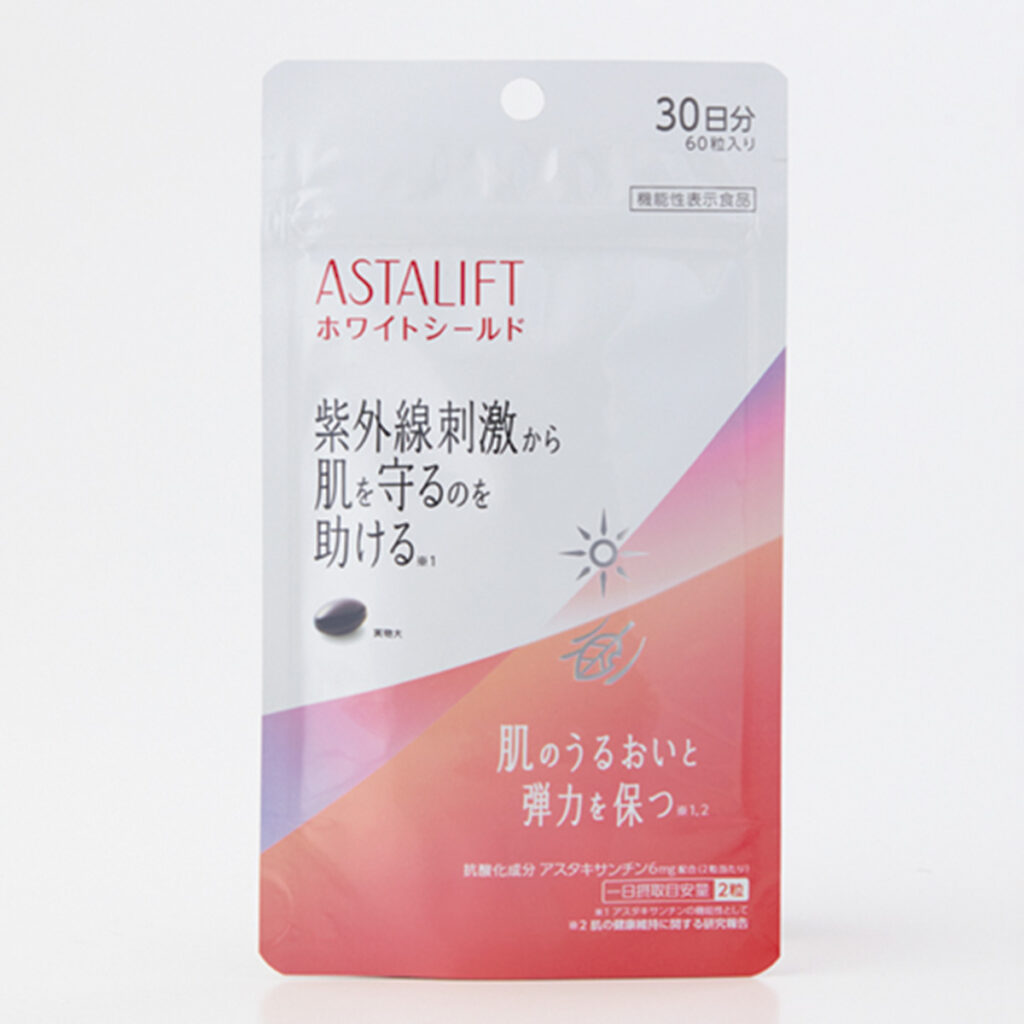 抗酸化作用で紫外線刺激から肌を守りつつ、潤いとハリ感をキープ。アスタリフト サプリメント ホワイトシールド 60粒入り¥4,320(富士フイルム)