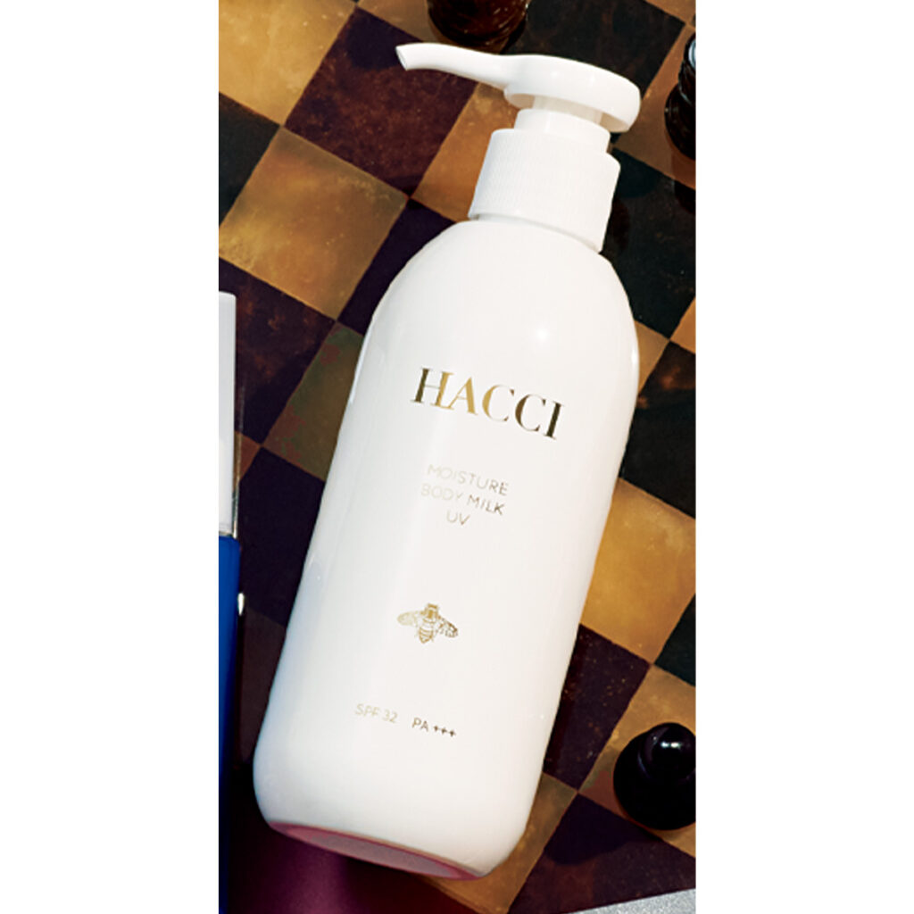ハチミツによる保湿効果が高く、スキンケアのようにストレスフリーなつけ心地。石鹸オフOK。モイスチャー ボディミルク UV SPF32/PA+++ 250ml¥6,820(HACCI)