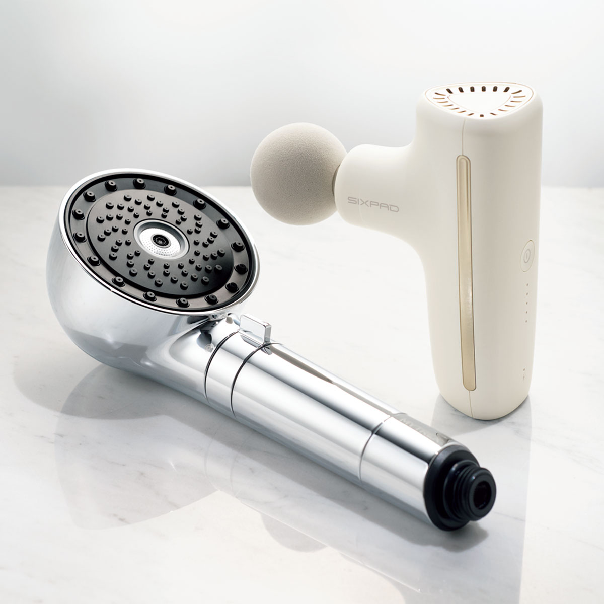 左_肌の内側から刺激してエイジングケアを叶える、マイクロカレントが流れます。MYTREX HIHO FINE BUBBLE+e マイクロカレントシャワーヘッド¥36,850(創通メディカル)