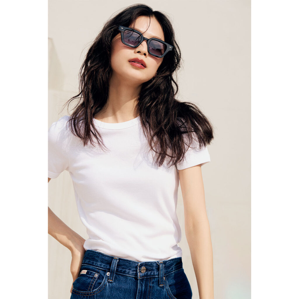 Tシャツ¥15,950(フローレフローレ/アルアバイル)デニム¥27,500(カルバン・クライン/カルバン・クライン カスタマーサービス)サングラス¥74,800(アーレム/グローブスペックス エージェント)ピアス¥7,920(ピルグリム/ZUTTOHOLIC)