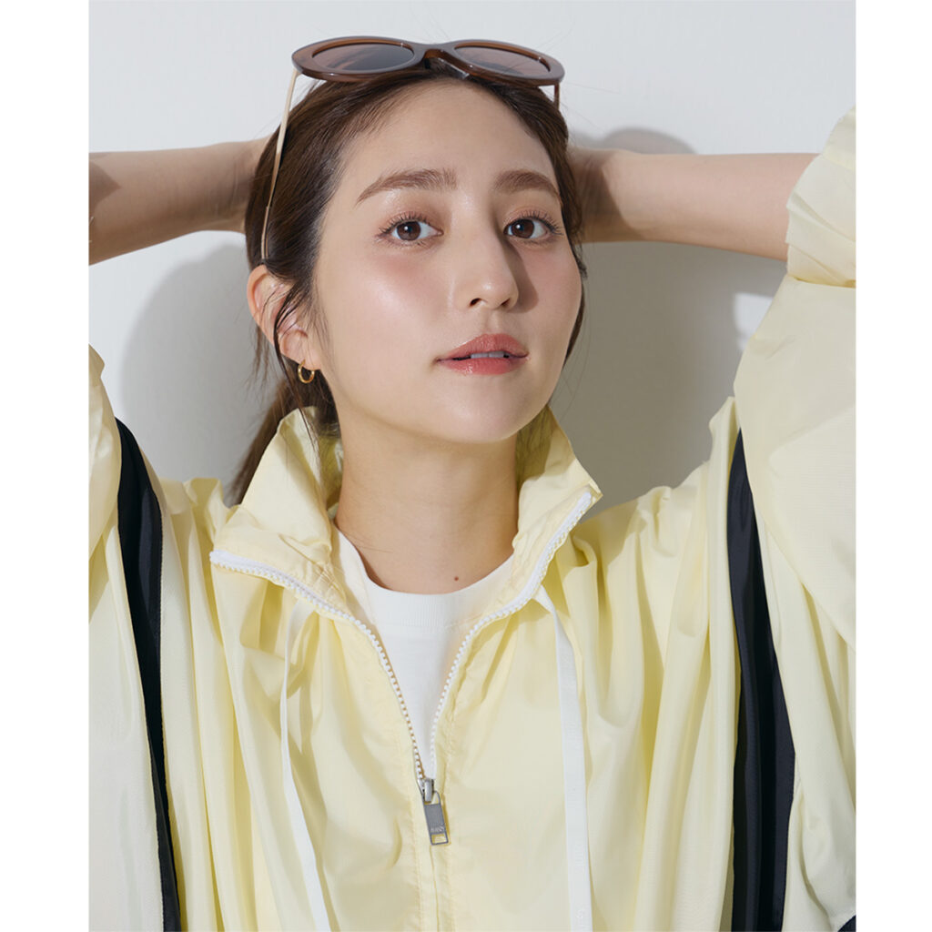 サングラスをおでこに上げるのは、母親譲りで染み付いているスタイル。アクティブに動き回る日は、顔周りの髪を押さえたいので、サングラスをカチューシャ代わりに活用。レイヤーがパラパラ落ちてくることもなく、見た目も気分もすっきり。ポニテは中間~低めの位置で結んで、張り切ってる感を回避します。