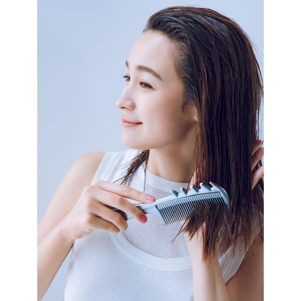 髪用のコンディショナーの場合は、ダメージが気になる毛先→中間の順になじませ、目の粗いコームでまんべんなく行き渡らせます。根元付近は脂っぽくなるので、軽めでOK。頭皮&髪用トリートメントの場合は、頭皮→毛先の順になじませて。