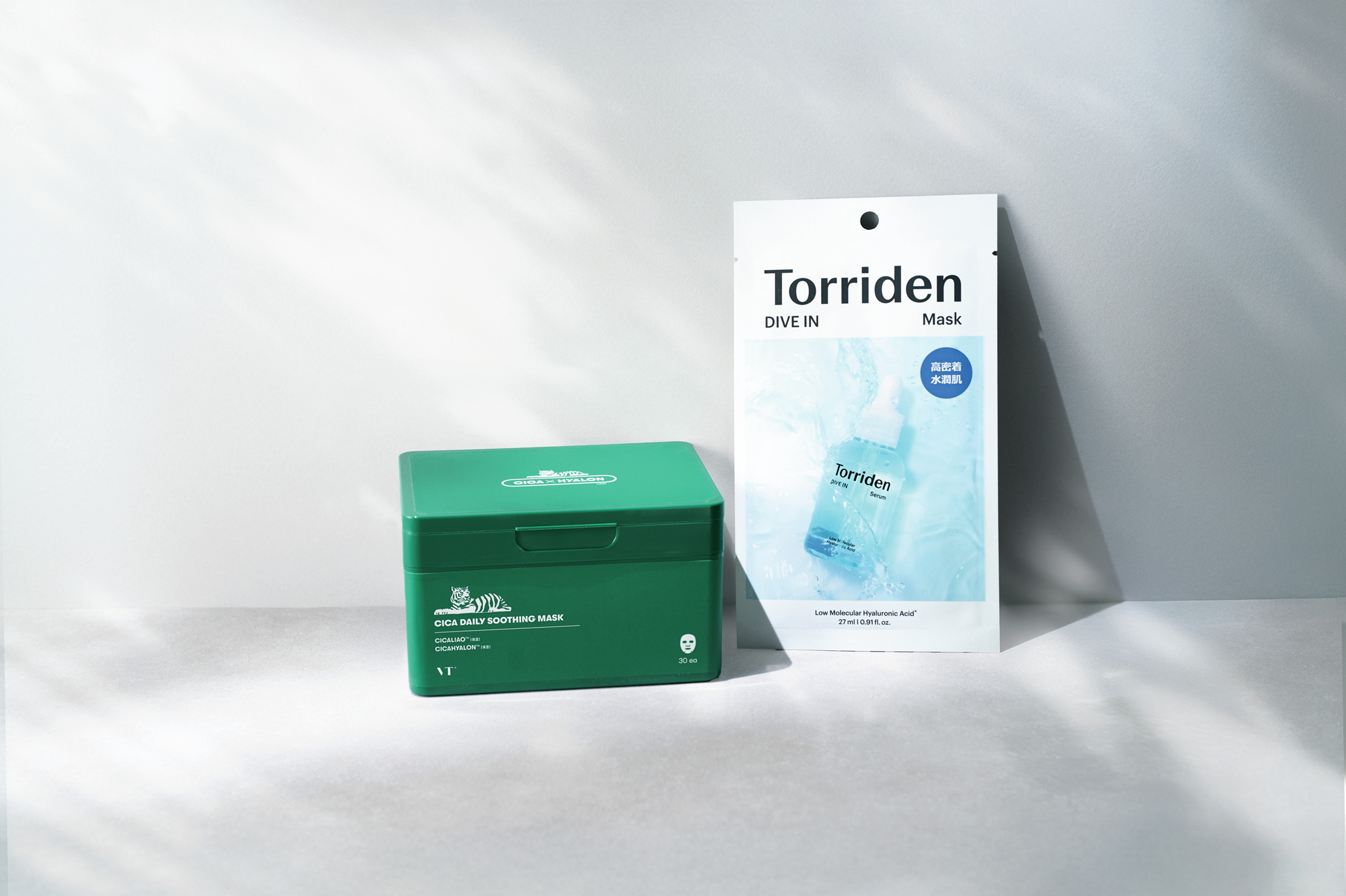 [左]独自成分のシカヒアルロンで肌荒れを予防しながら保湿!0.2mmの極薄シートが密着するので、ながらケアにも。VT CICAデイリースージングマスク 30枚〈350g〉¥2,420(VT COSMETICS)