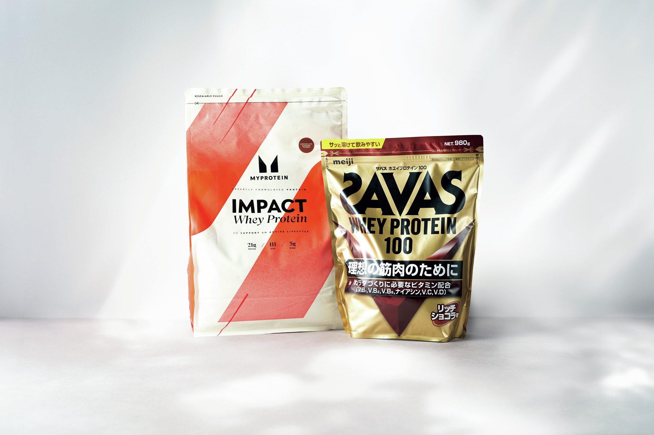 [右]吸収のいいホエイプロテインを100%使用。ビタミンB群やC、Dが入っていて、体作りをサポート。ザバス ホエイプロテイン100 リッチショコラ味 980g¥7,300(明治)