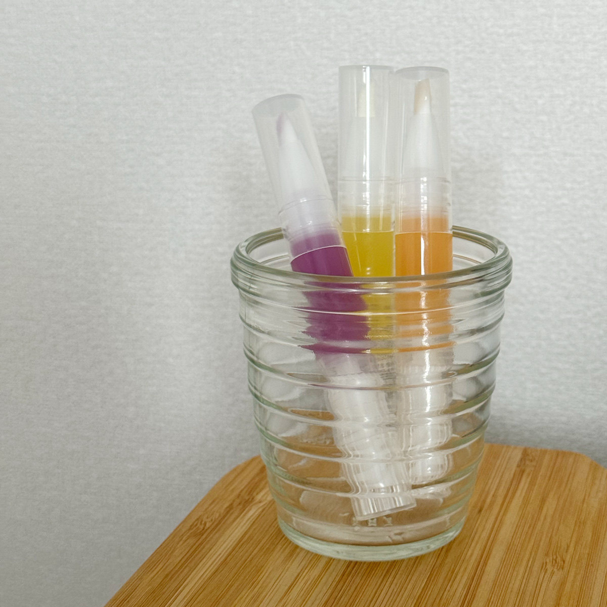 オイルカラーがカラフルでパッと見のビジュアルが可愛いのもお気に入りポイントのひとつ。なんてことのないガラス容器に立てておくだけで、なんとなく“見せる収納”風に!笑 オイルの残量もぱっと見でわかるので、そろそろ無くなりそう…というタイミングで次を買い足せるから、「あれ、気づいたらなくなってた…」ということも防げます(ズボラにはありがたい仕様…!)。