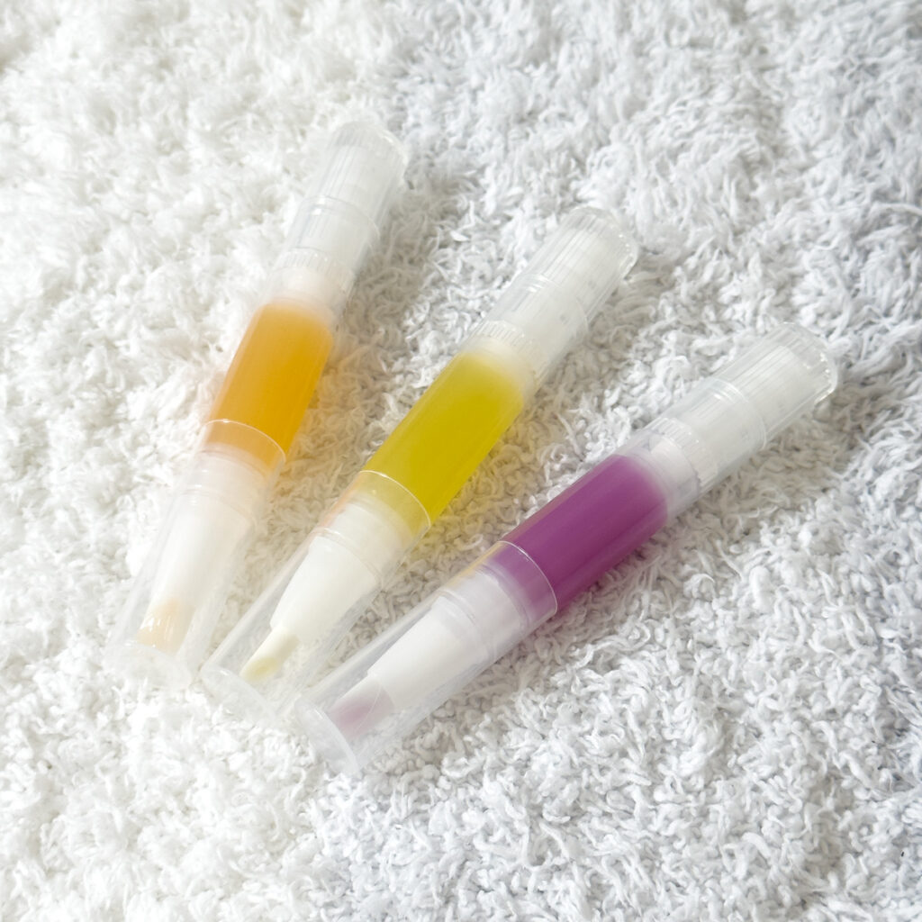 ちなみにこの甘皮ケアオイルとオレンジ色のネイルケアオイルは無香料。香りものは避けたいときにも気にせず使えるのがうれしい! 私は無香料タイプを持ち歩き用に、ラベンダー&オレンジの香り付きタイプを仕事中やリラックスタイム用に活用しています。