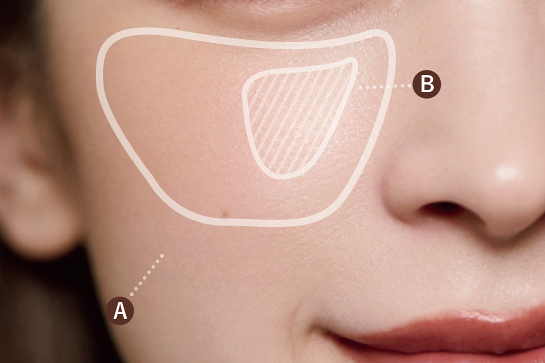 SNIDELのリキッドチークをAのように小鼻の横から横長に広範囲に。その後NARSのパウダーの青みチークをBの部分、目頭の下から黒目の外側までに三角形になるように。