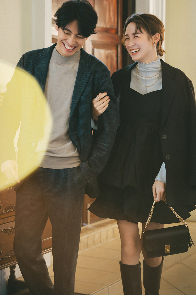 【Scene1】[Sachi]コート¥59,400〈ルージュ・ヴィフ〉スカート¥16,500〈ルージュ・ヴィフ アンナ〉バッグ¥14,300〈ロウェル シングス〉(すべてアバハウスインターナショナル オンラインストア)ストール¥4,990アームウォーマー¥3,990(ともにアンフィーロ/オンワード樫山)[Juan]コート¥49,500(アバハウス/アバハウスインターナショナル オンラインストア)ニット¥46,200パンツ¥57,900(ともにディーヒム/フィルム)メガネ(スタイリスト私物)【Scene2】[Sachi]カーディガン¥7,990(アンフィーロ/オンワード樫山)カットソー¥3,850〈ネノム〉スカート¥9,900〈ユジーヌ〉(ともにジーンズ ファクトリー 卸団地本店)[Juan]フリース¥14,960(フロストライン×ジーンズ ファクトリー/ジーンズ ファクトリー 卸団地本店)パンツ¥18,920(アバハウス/アバハウスインターナショナル オンラインストア)Tシャツ(スタイリスト私物)【Scene3】[Sachi]ジャケット¥14,960(ノミネ/アバハウスインターナショナル オンラインストア)ワンピース¥30,800(ダブルスタンダードクロージング/フィルム)カットソー¥3,850(ネノム/ジーンズ ファクトリー 卸団地本店)バッグ¥13,750(アルテミス by ダイアナ/アルテミス by ダイアナ アーバンドック ららぽーと豊洲店)ブーツ¥42,900(ダイアナ/ダイアナ 銀座本店)イヤリング¥6,820〈イットアトリエ〉ネックレス¥46,200〈ミチ ウィルウェイ〉(ともにフォーティーン ショールーム)リング※スタイリスト私物[Juan]ジャケット¥63,800ニット¥42,900パンツ¥35,200(すべてデザインワークス/デザインワークス 六本木ヒルズ店)