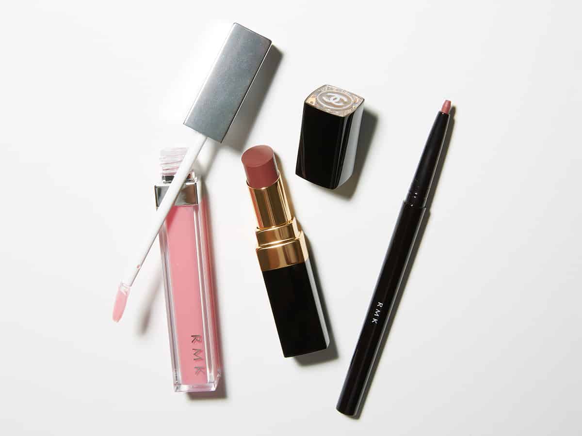 【右から】RMK イレジスティブル スケッチリップライナー 03 ¥2,200(RMK Division) シャネル ルージュ ココ フラッシュ #56 ¥4,000(シャネル) RMK リップジェリーグロス 09 ¥2,200(RMK Division)