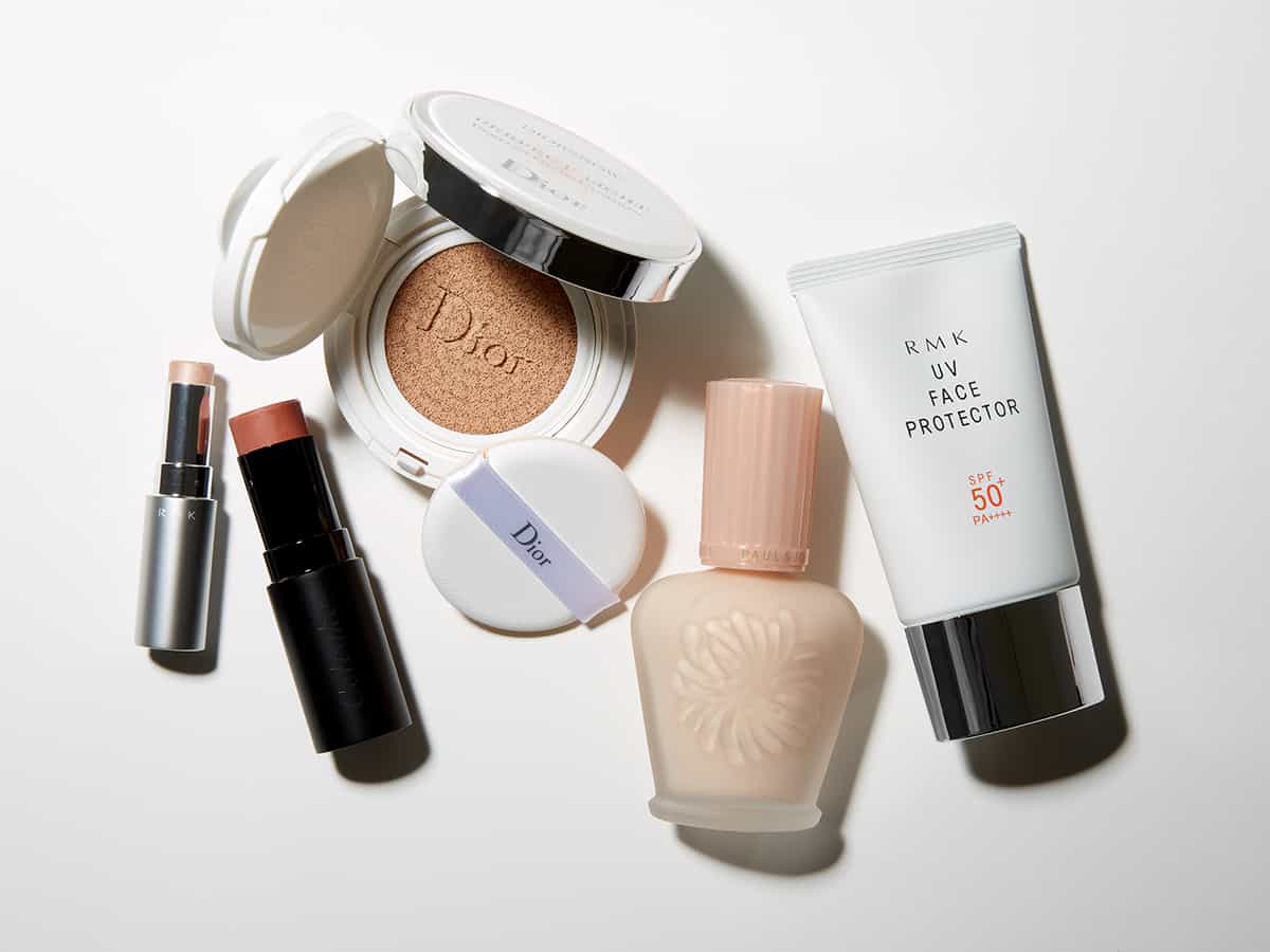 【右から】RMK UVフェイスプロテクター50(SPF50+/PA++++)50g ¥3,000(RMK Division) ポール & ジョー モイスチュアライジング ファンデーション プライマー S 01(SPF15/PA+)30ml ¥3,500(ポール & ジョー ボーテ) ディオール スノー パーフェクト ライト クッション 全7色(SPF50/PA+++)15g×2 ¥8,500(パルファン・クリスチャン・ディオール) セルヴォーク カムフィー スティックブラッシュ 03 ¥3,500(セルヴォーク) RMK グロースティック¥2,000(RMK Division)