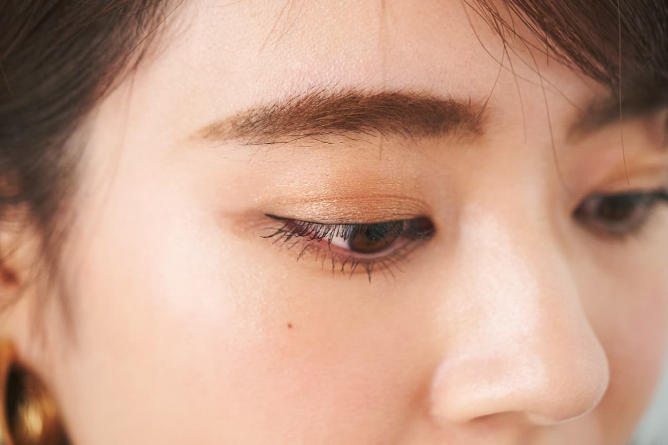 ③アイシャドウを指でまぶた全体にのせ、二重幅に重ねて自然なグラデーションに。