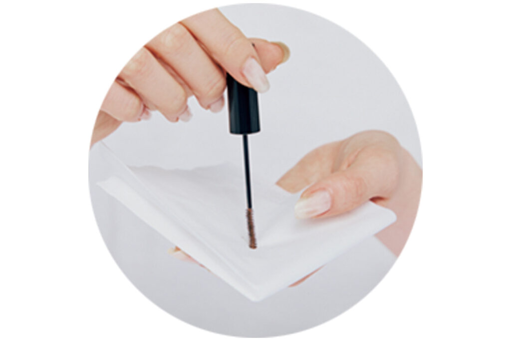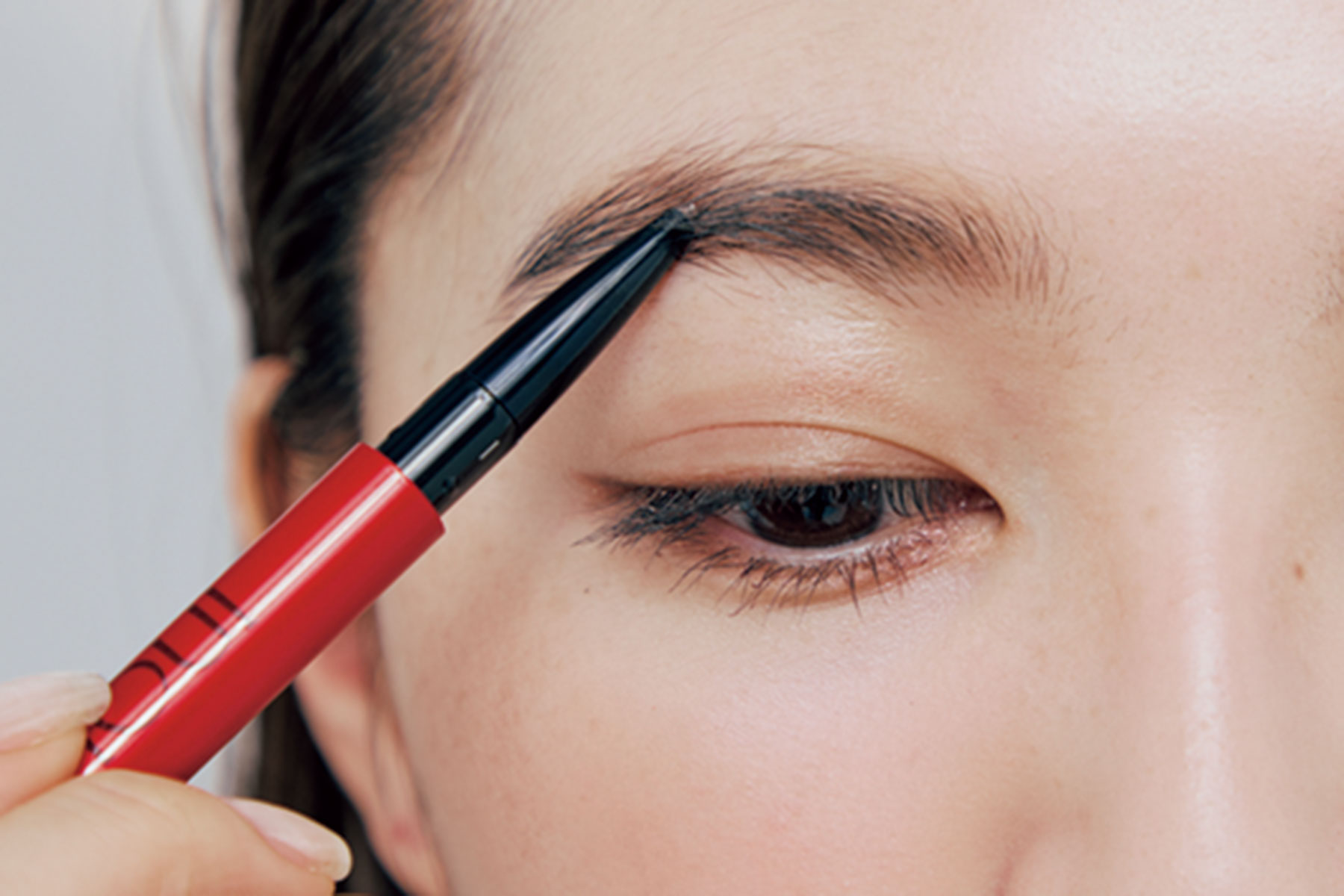 Dの眉マスカラは毛の存在感を程よく引き立てるベーシックなブラウンカラーをチョイス。眉頭以外、毛流れを崩さないように表面をサラリと撫でるイメージ。