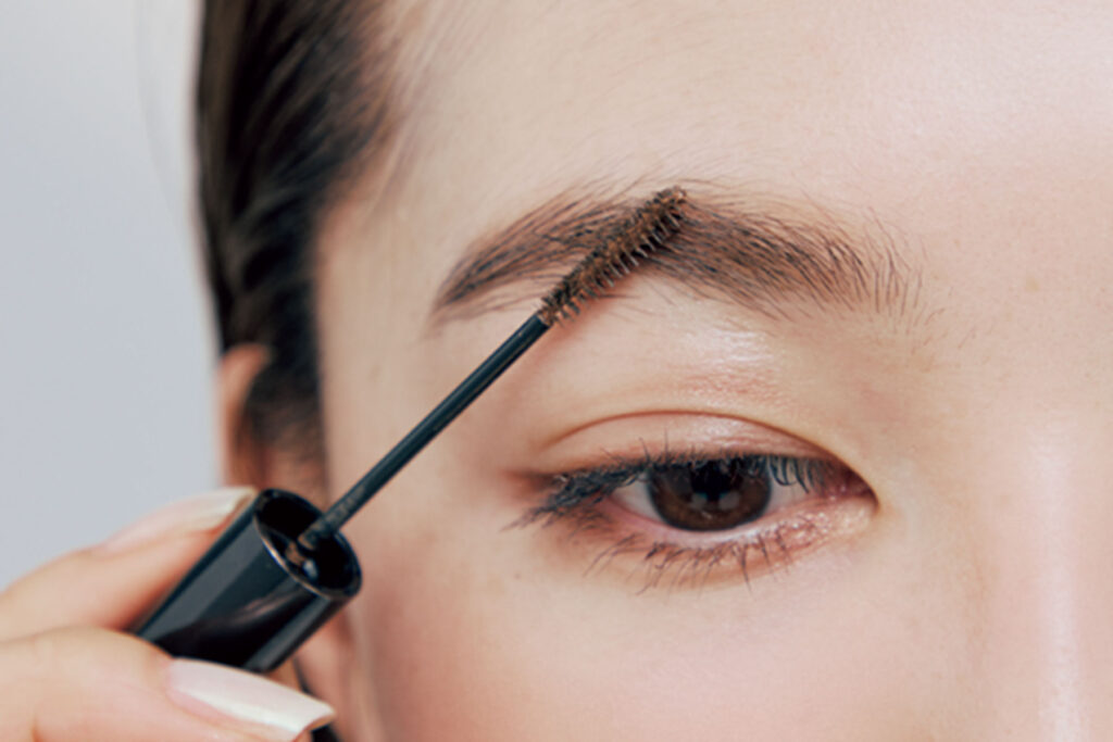 Eのクリアマスカラで眉頭を中心に毛流れを強調&固定。眉頭は扇状にしっかり立たせると立体感がさらにアップ。