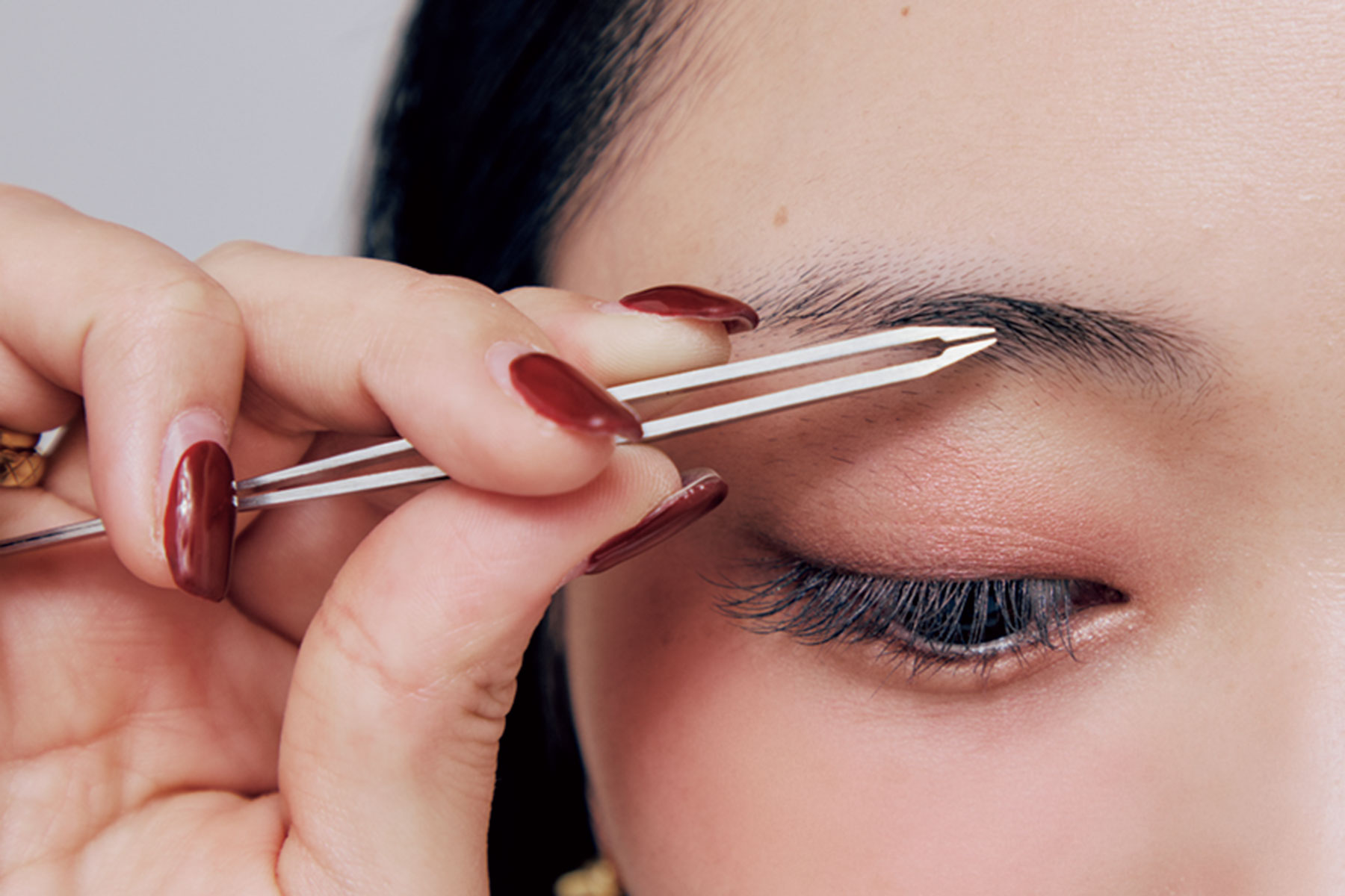 下準備として毛を間引いて形を整える。カットはせず、抜く&眉周囲の不均等な産毛を剃って。黒目上を数本間引いて全体の印象を軽くする。