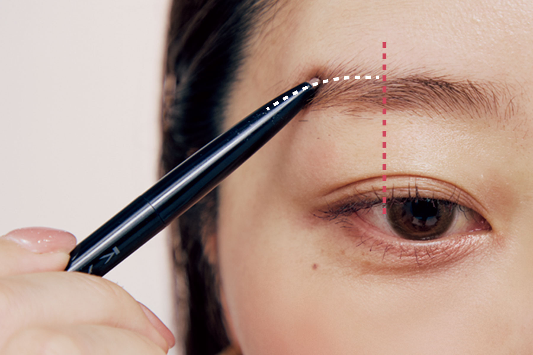 ブラシで整えた後、ペンシルで眉下(黒目外~眉尻)のラインを引く。目と眉下の間は黒目1つ分に。平らな面で毛流れに沿って書く。