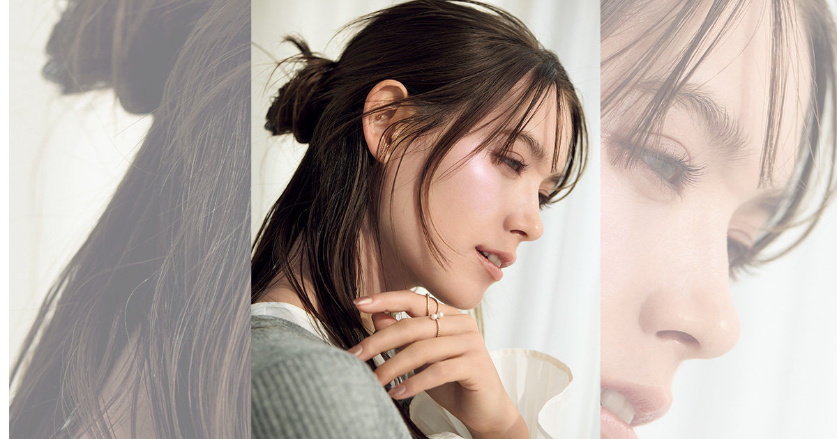 【衣装クレジット】ニット¥27,500(シーニュ)ブラウス¥9,900(セルフィスト/アバハウスインターナショナル オンラインストア)リング(中指)¥159,500リング(人さし指)¥194,700(ともにプライマル)