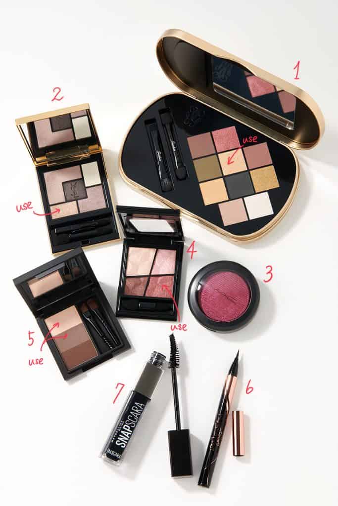 <右から>①パレット ゴールデンランド ¥10,200(ゲラン) ②クチュール クルール パレット13 ¥7,800(イヴ・サンローラン)③エクストラディメンションブラッシュ ラップド キャンディ ¥3,500(M・A・C)④ヴィセ ジェミーリッチアイズPK-6 ¥1,200(KOSE)⑤グレイトブロウ リンガリング ¥4,100(M・A・C)⑥ハイパーシャープライナー BR-2 ¥1,200 ⑦スナップスカラ 01 ¥1,200(ともにメイベリン ニューヨーク)