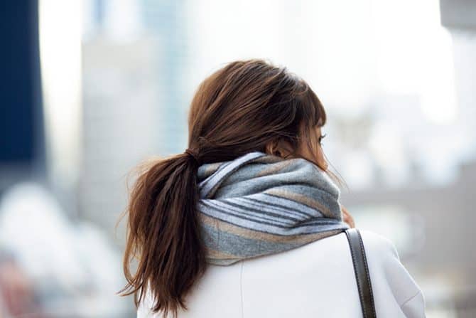 ダウンスタイルにストールだと乱れがちなロングヘアは、ポニテですっきり可愛く。耳の高さで結んだら、おくれ毛を出して。風ではらりと顔にかかった瞬間、さらに小顔見え!