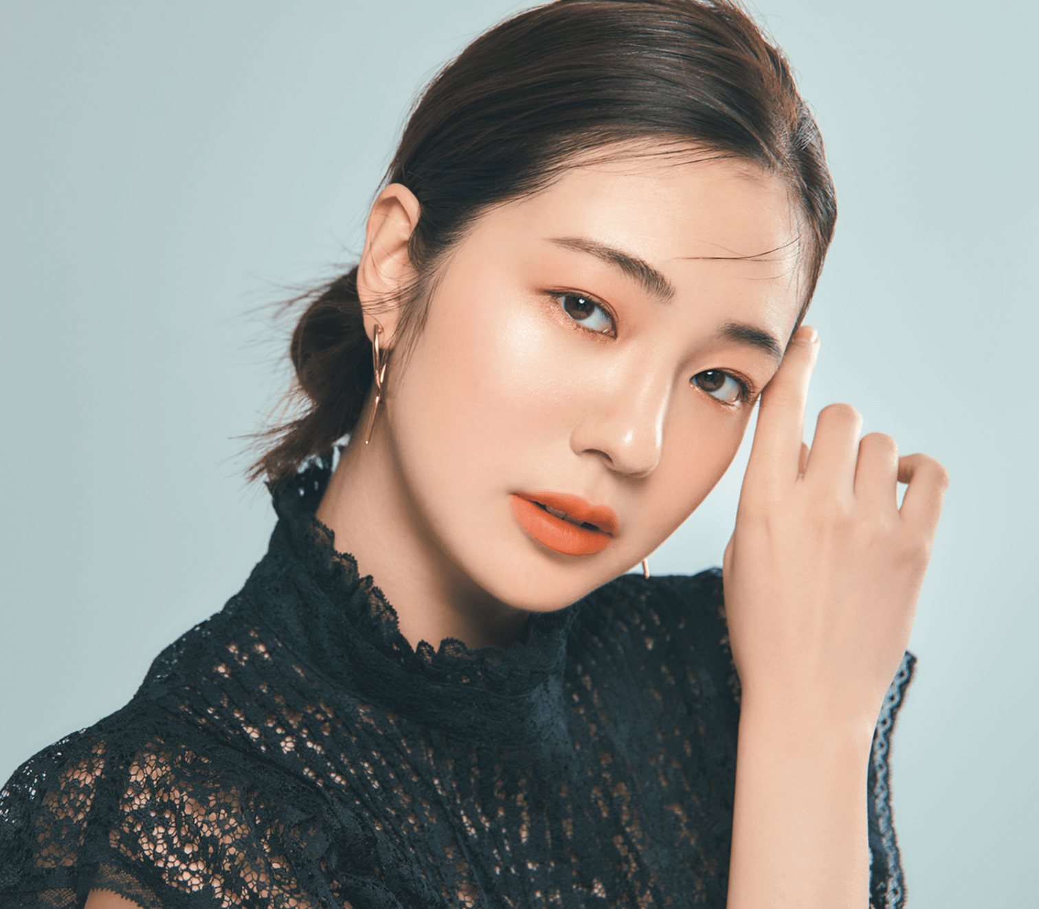 より華やかなツヤ顔を作る時は、ベースはパール下地と保湿力高めのセラムファンデーションを使います。ベースで〝発光する肌〟が完成したら、目元やチーク、リップの色味は茶系~オレンジをセレクト。上瞼とリップはマットな質感を選んで、女らしいけどオシャレ感のある顔に。今の韓国のトレンドは赤リップよりオレンジリップです。