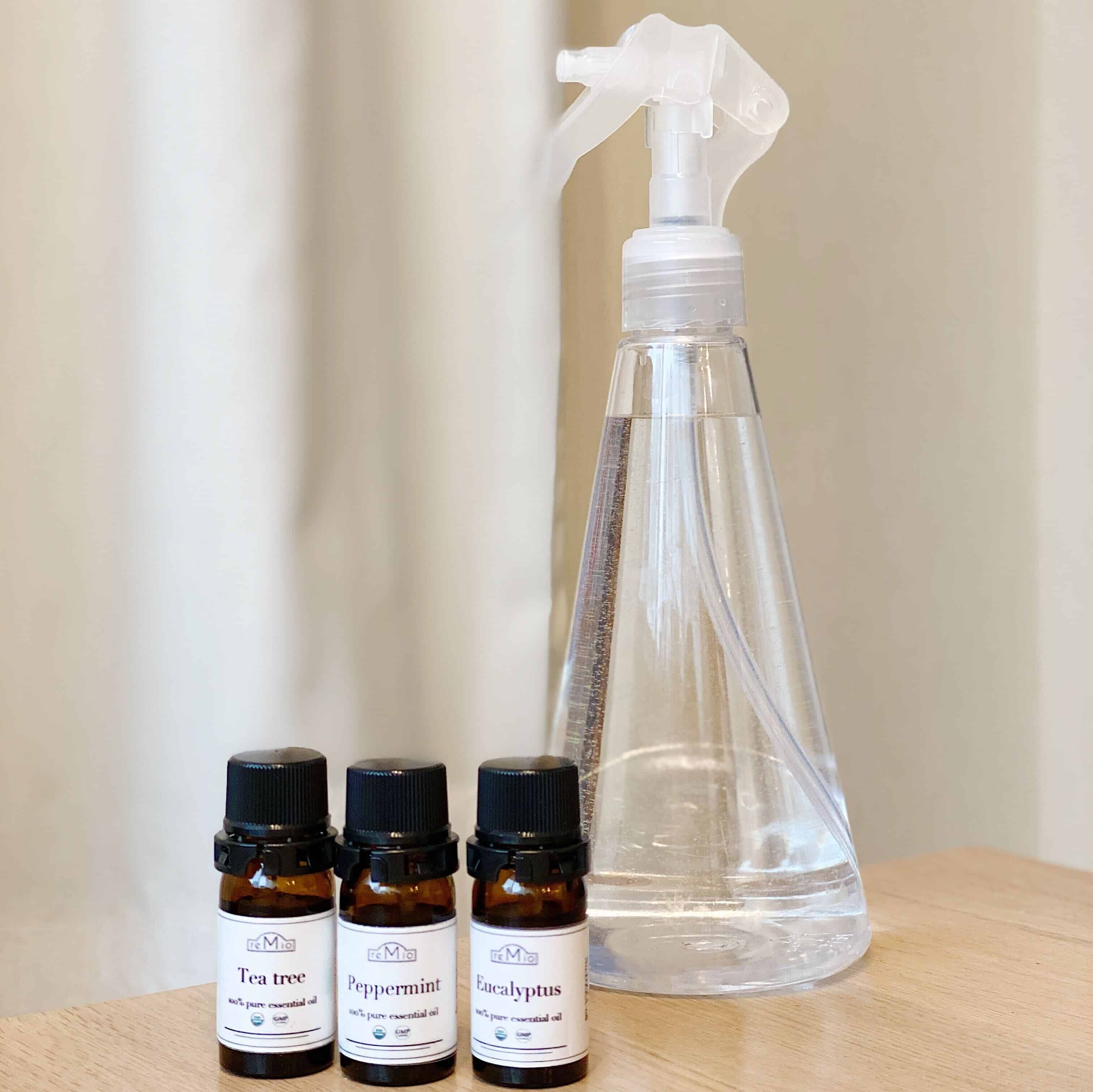 除菌アイテムの完売が続き、なかなか購入が難しくなっていますよね。そんなときにはアロマスプレーを自分で作ってみるという手もあります。そこで使うのが、精製水またはラベンダーウォーター50mlと、精油(ティーツリー、ペパーミント、ユーカリ)をそれぞれ3滴ずつブレンドしてよく振り混ぜてから使います。エアーフレッシュナーとして、手指やマスクの除菌や消毒にも使えます。2週間ぐらいで使い切ってくださいね。