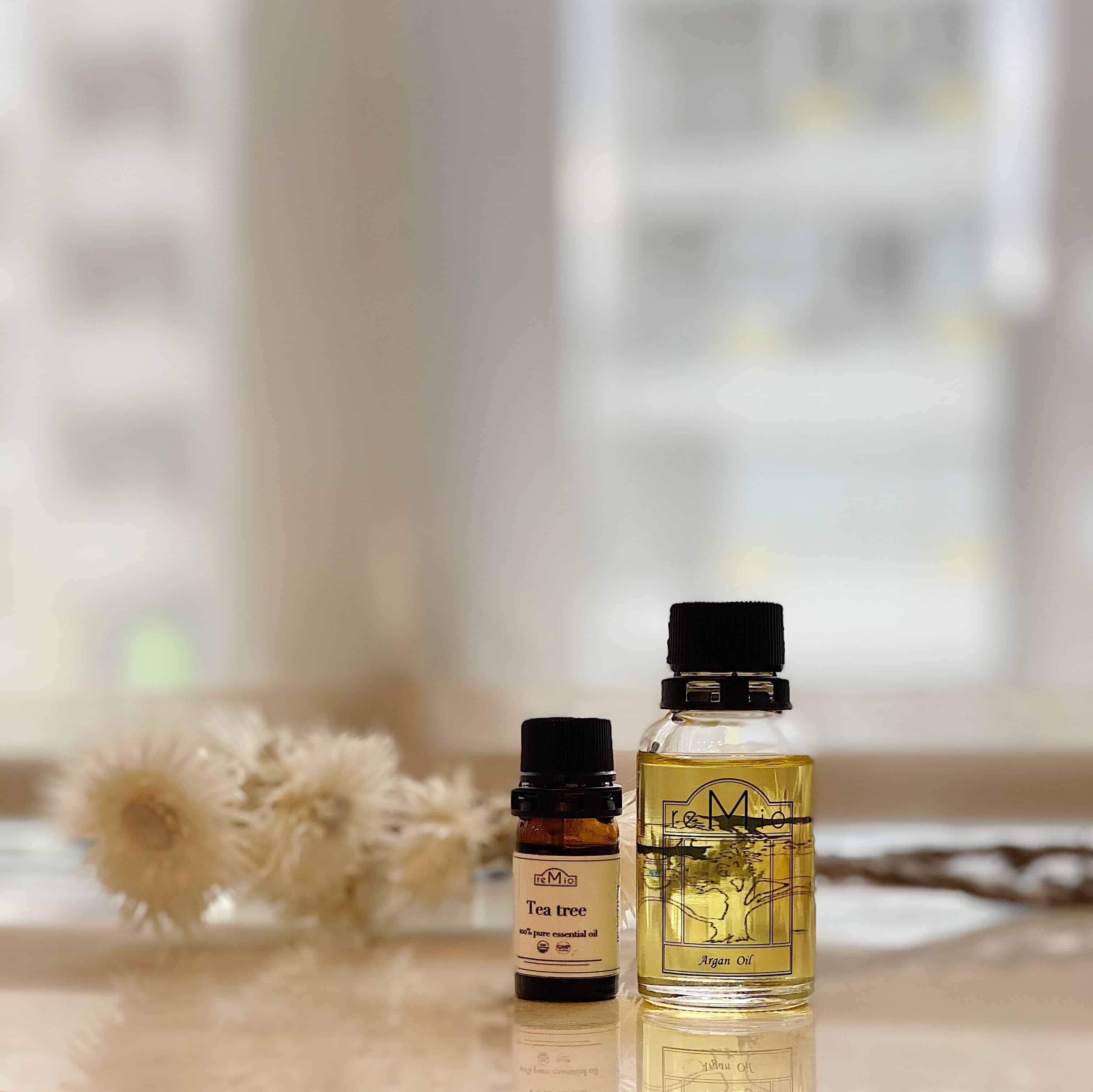 2~3滴のアルガンオイルにティーツリーの精油を1滴加えてブレンドします。アルガンオイルは保湿だけではなく、肌のバリア力を高め、キメを整えてくれます。スーッとした清涼感のある香りでリフレッシュできる「ティーツリー」の精油は、トラブルスキンケア、抗菌、抗炎症などの働きもあるので、この時期にピッタリです。
